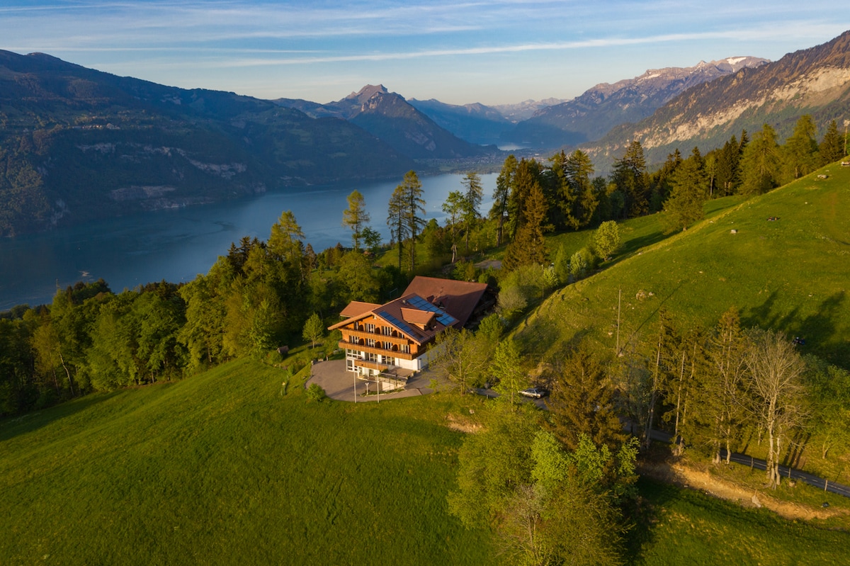 El chalet «Villa Chalchsaati» se encuentra en el valle de Kander en una meseta a 1000 metros sobre el nivel del mar, justo enfrente del Niesen, la pirámide natural más grande de Europa. La propiedad está bordeada por un arroyo romántico e incluye un bosque para promover la biodiversidad. La zona agrícola escasamente poblada se encuentra a 15 minutos en coche de la salida de la autopista de Spiez y, por lo tanto, se encuentra en el centro de los famosos lugares del Oberland bernés.