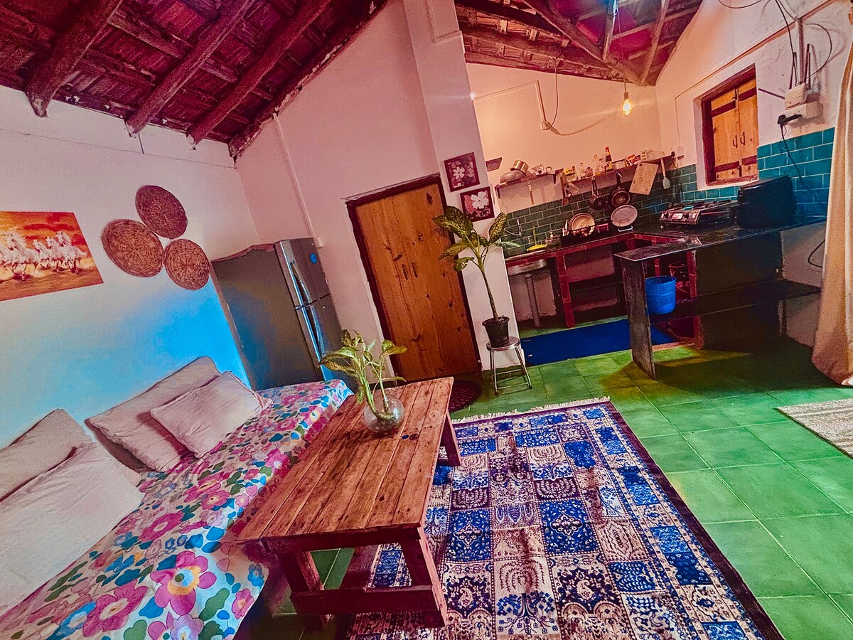 Tucked beneath the generous shade of a 25-year-old Chiku tree, this independent garden facing cottage offers a soulful retreat, around 300m from Palolem Beach. Surrounded by yoga shalas and local eatery joints, the homestay sits in vibrant yet laid-back neighbourhood. Whether you're here for a weekend or longer stay, the cottage invites you to slow down and rediscover simple joys - barefoot garden walks, sunset meditations, or watching the sky shift through the Chiku canopy.