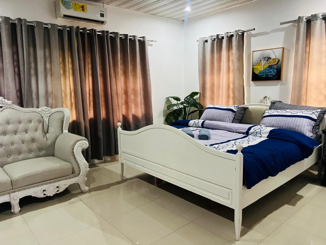 ¡Olvídate de tus preocupaciones en esta espaciosa y serena casa de huéspedes 1/1 en Cape Coast, Ghana! Tendrás 2 unidades de aire acondicionado frío que puedes encontrar en el dormitorio y la sala de estar. Ventiladores de techo en cocina, salón y dormitorio. Disfruta de una agradable ducha caliente y una increíble cama tamaño queen suave y cómoda para relajarte. Mientras te relajas, desconecta con Netflix o nuestro excelente servicio de wifi. Cocina de buen tamaño con todas tus necesidades básicas de cocina para crear una comida increíble. Una pequeña estación de trabajo para gestionar los arreglos de negocios de última hora.