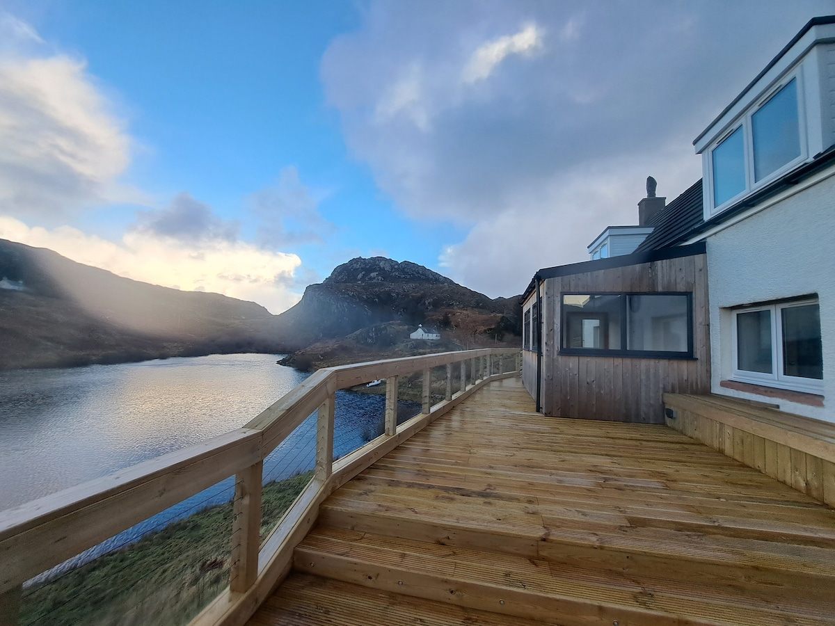 Eddrachillis House es una casa cómoda y moderna con vistas espectaculares a la bahía de Badcall y sus islas, a dos millas al sur de Scourie en la NC500. La casa está situada en 100 acres de tierra desde la costa hasta el lago de la colina. La espaciosa sala de estar de planta abierta contiene una cocina muy bien equipada y un comedor donde puedes cenar bajo las estrellas. El acogedor salón tiene una estufa de leña y puertas de patio que dan a la terraza delantera con unas vistas impresionantes. Hermosos baños y camas grandes muy cómodas.