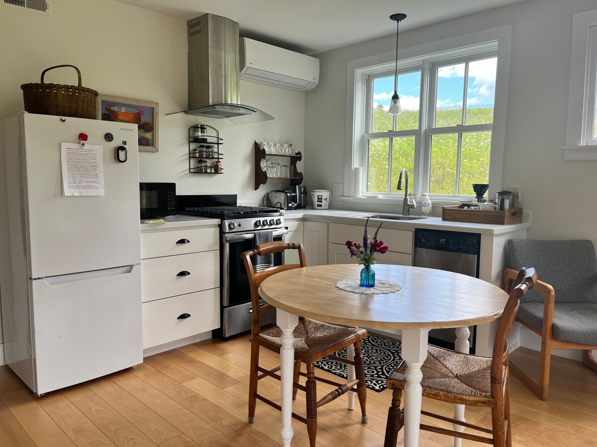 Encantadora casa de huéspedes llena de luz construida en 2019. Situada en una propiedad de 12 acres con preciosas vistas, cielo nocturno estrellado, excelentes pistas para ciclismo, senderismo y esquí de fondo desde la casa de campo. Junto al área natural de Raven Ridge, con una corta caminata que ofrece hermosas vistas del valle y del lago Champlain. Hinesburg, Bristol y Vergennes están a 10-20 minutos, a 30 minutos de Burlington y Middlebury. A 2 horas de Montreal.