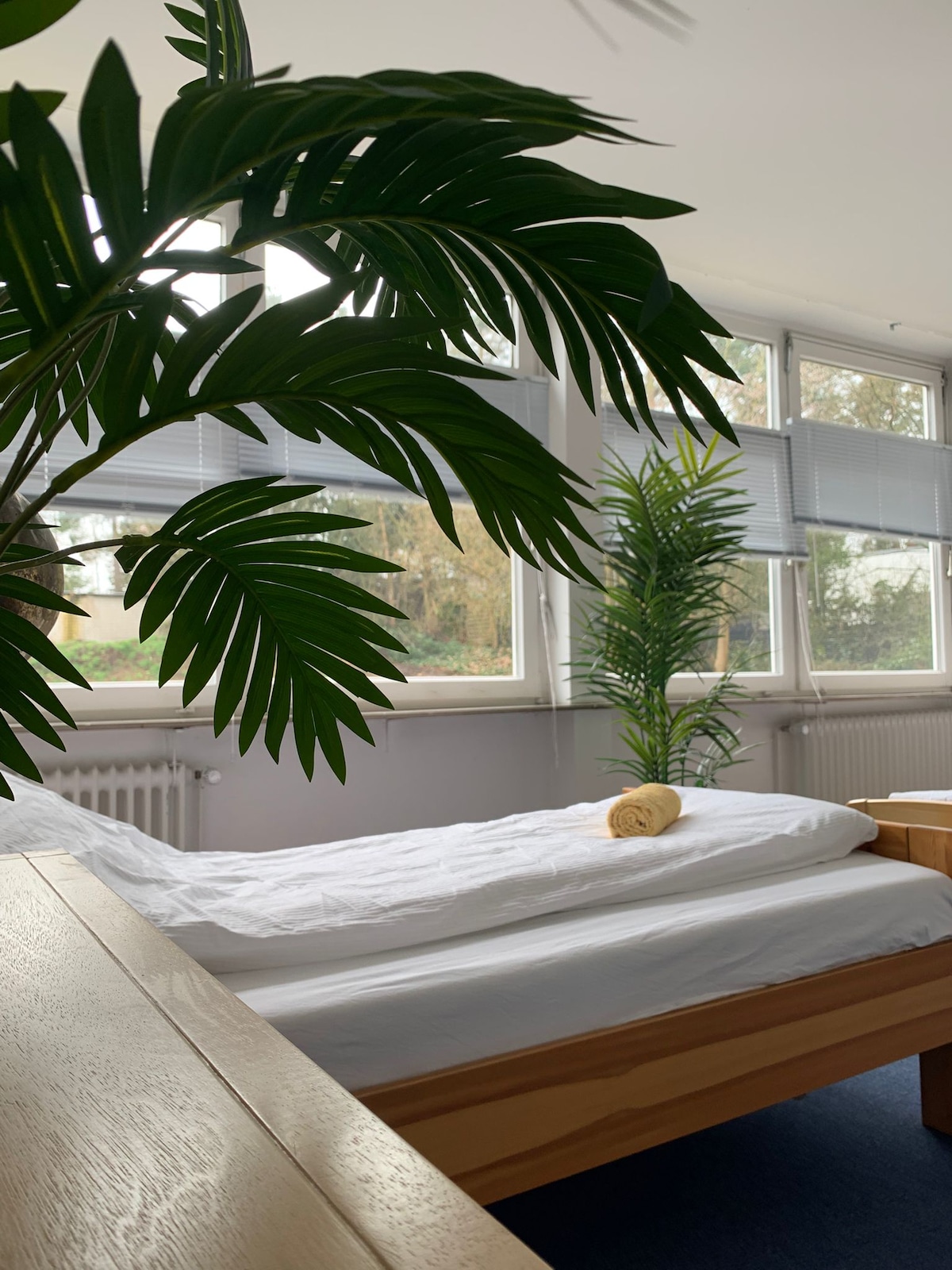 The freshly renovated apartment is situated in a light souterrain of a flat-roofed bungalow that is located in a calm and quiet neighborhood in the north of the city. The apartment includes a large bedroom with a king size bed, a cozy living and dining room with a comfortable pullout couch, a modern shower bath and a complete built-in kitchen. The city center is only a fifteen minute walk away, but there is also a bus station right in front of the door as well as free parking.