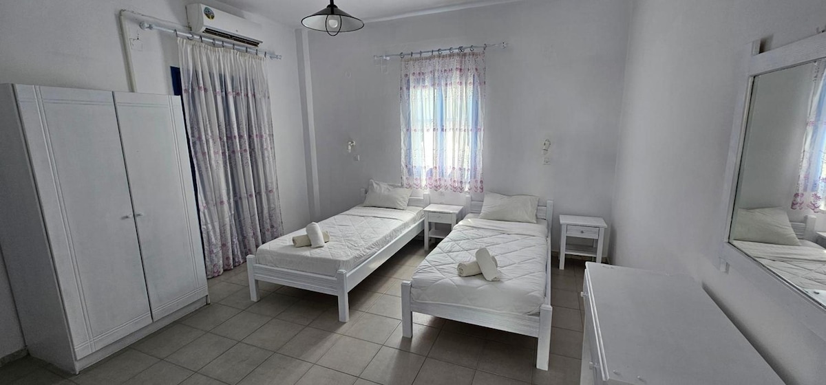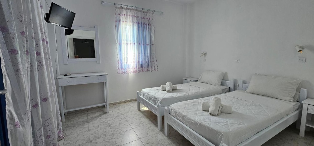 Tipo: 2 habitaciones contiguas Tamaño: 41 m2 Capacidad: 4 Distancia de la playa: 40 m Dormitorios: 2 (1 cama doble y 2 camas individuales) Baño: 1 (ducha de agua caliente y artículos de tocador) Cocina americana: Sí Tabernas y tiendas: 35 m Farmacia: 20 m Aparcamiento público: 25 m Parada de autobús: 15 m Panadería: 90 m Mercado:20 m Servicios de pago: alquiler de carmoto,recogida, excursiones guiadas en autobús y mar al volcán-Anafi&Oia Servicios: ropa de cama y toallas/armario/secador de pelo/caja fuerte/TV/2 aire acondicionado/nevera, placa eléctrica, cubiertos, utensilios de cocina, hervidor eléctrico de té y agua/cafetera de filtro y café/wifi gratuito