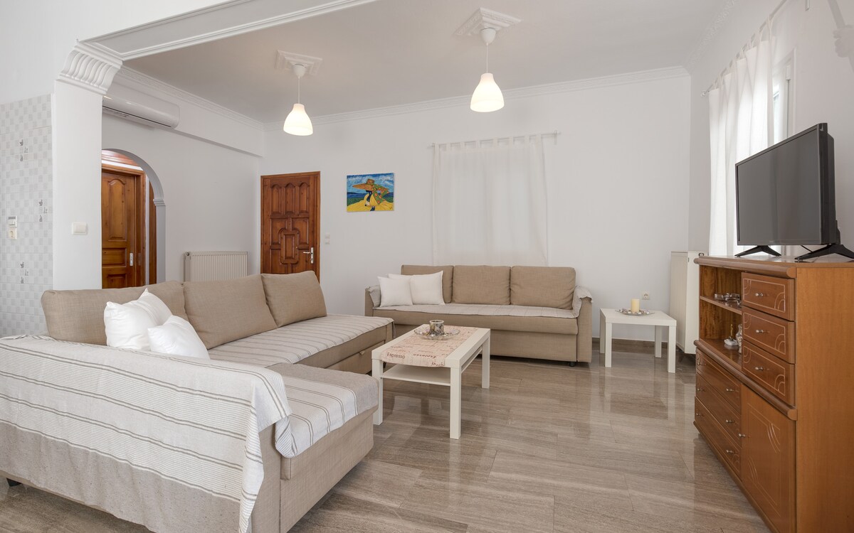 Un espacioso apartamento de 73 metros cuadrados con dos dormitorios, sala de estar, cocina totalmente equipada y baño, decorado en colores claros y abierto a un balcón. Puede alojar hasta 8 personas y es adecuado para grupos de amigos o familias que quieran disfrutar de su estancia en Naxos combinando un barrio tranquilo y actividades. Las instalaciones incluyen: 3 aires acondicionados, 3 televisores de pantalla plana, colchones anatómicos, cocina totalmente equipada, lavadora y artículos de baño.