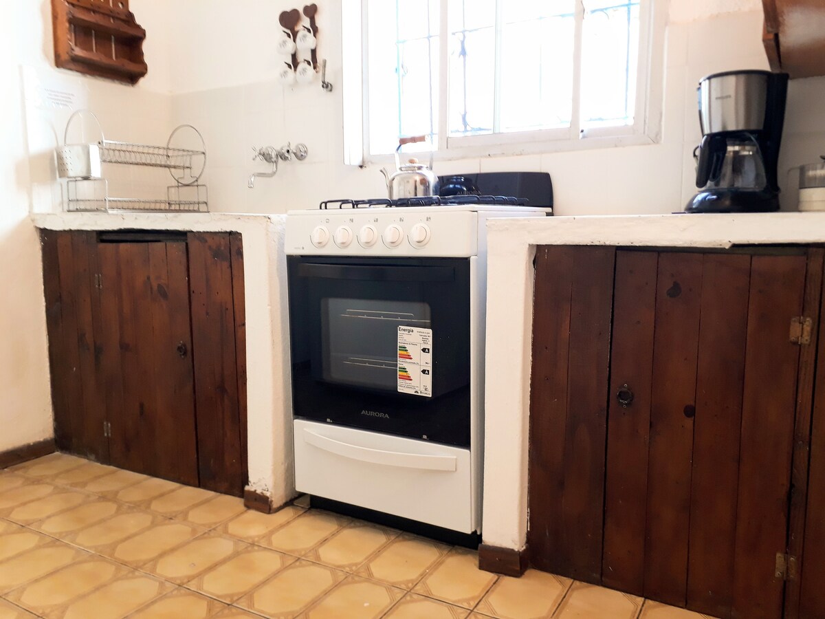Increíble Micro Casa de Concreto en pleno bosque, respetando la naturaleza del lugar, únicoambiente con una cama queen, mesa escritorio, 2 sillas y WiFi. Baño con ducha, lavamanos, inodoro. Kitchenette con bacha, pava eléctrica, microondas y heladera con freezer, NO está para cocinar. Muy iluminada con el mar a 700m y el centro comercial a 600m. Esta hermosa casa está escondida detrás de la casa principal con total privacidad y autonomía. Asador exterior para uso común del lugar. Bienvenidos!
