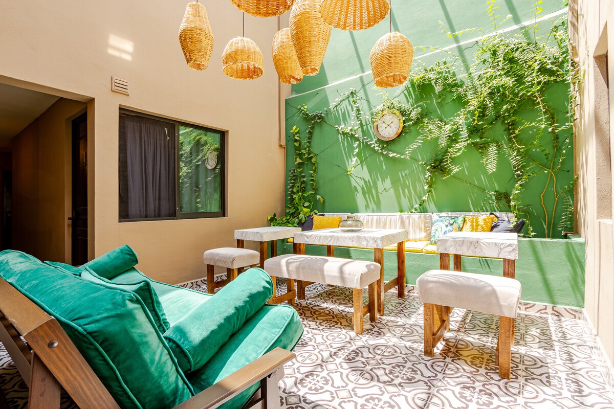Estarás cerca de todo! A solo 3 minutos caminando del Palenque, Casino, Restaurantes, Bares, Jardín de San Marcos y la Plaza de Toros. La habitación incluye: • Cama matrimonial cómoda • Baño privado con agua caliente • Aire acondicionado • WiFi • Caja de seguridad • Televisión Disfruta de nuestra casa-hotel, ubicada en una zona estratégica y tranquila del perímetro ferial, con un hermoso patio compartido donde podrás disfrutar de café, agua y té gratuito. Te encantará hospedarte aquí!