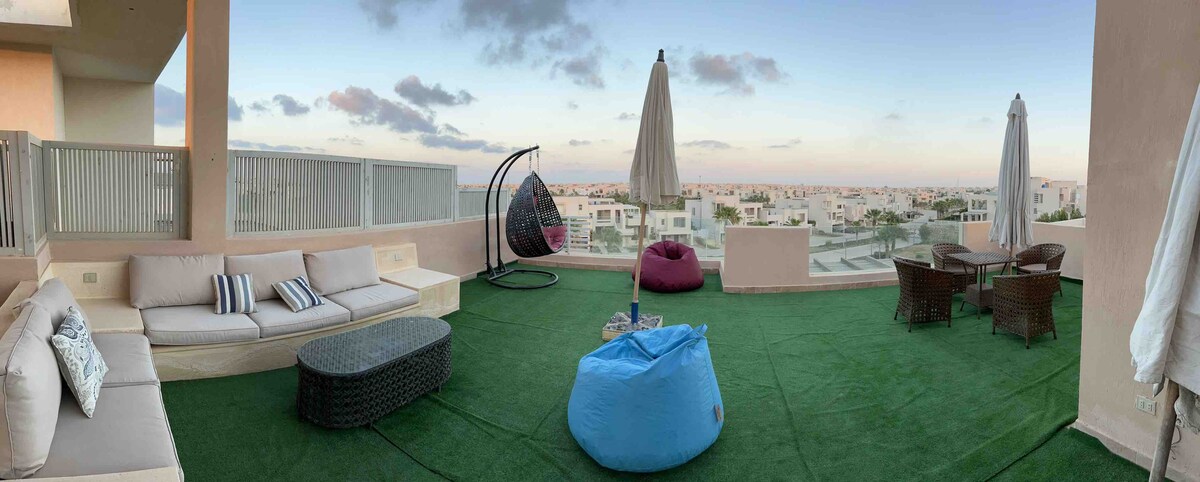 Crea recuerdos en este lugar único y apto para familias. Apartamento de un dormitorio modernamente amueblado con jardín al aire libre y piscina comunitaria pública. También tienes los privilegios de visitar las lagunas y piscinas de Marassi.