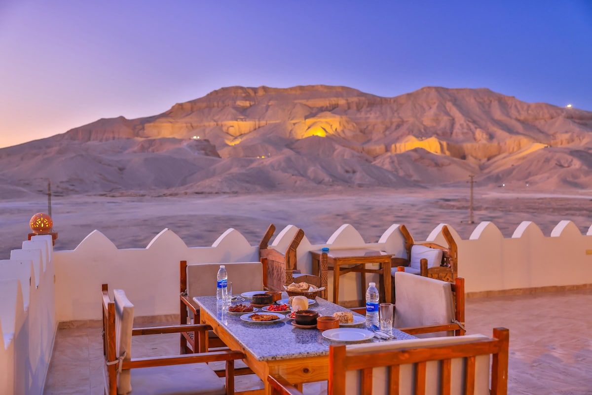 Beit El Hana se encuentra cerca de todos los lugares de interés importantes, como el Valle de las Reinas, el Valle de los Reyes y el Templo de Medinet Habu. Beit El Hana ofrece una hermosa vista del amanecer y el atardecer, y también se puede disfrutar de paseos en globo aerostático por la mañana. También ofrecemos una azotea y un punto de vista ideal para ver el eclipse solar de 2027. La azotea aquí será perfecta para ver el eclipse, y hay un espacio aquí que ofrece una vista impresionante del Valle de la Reina.