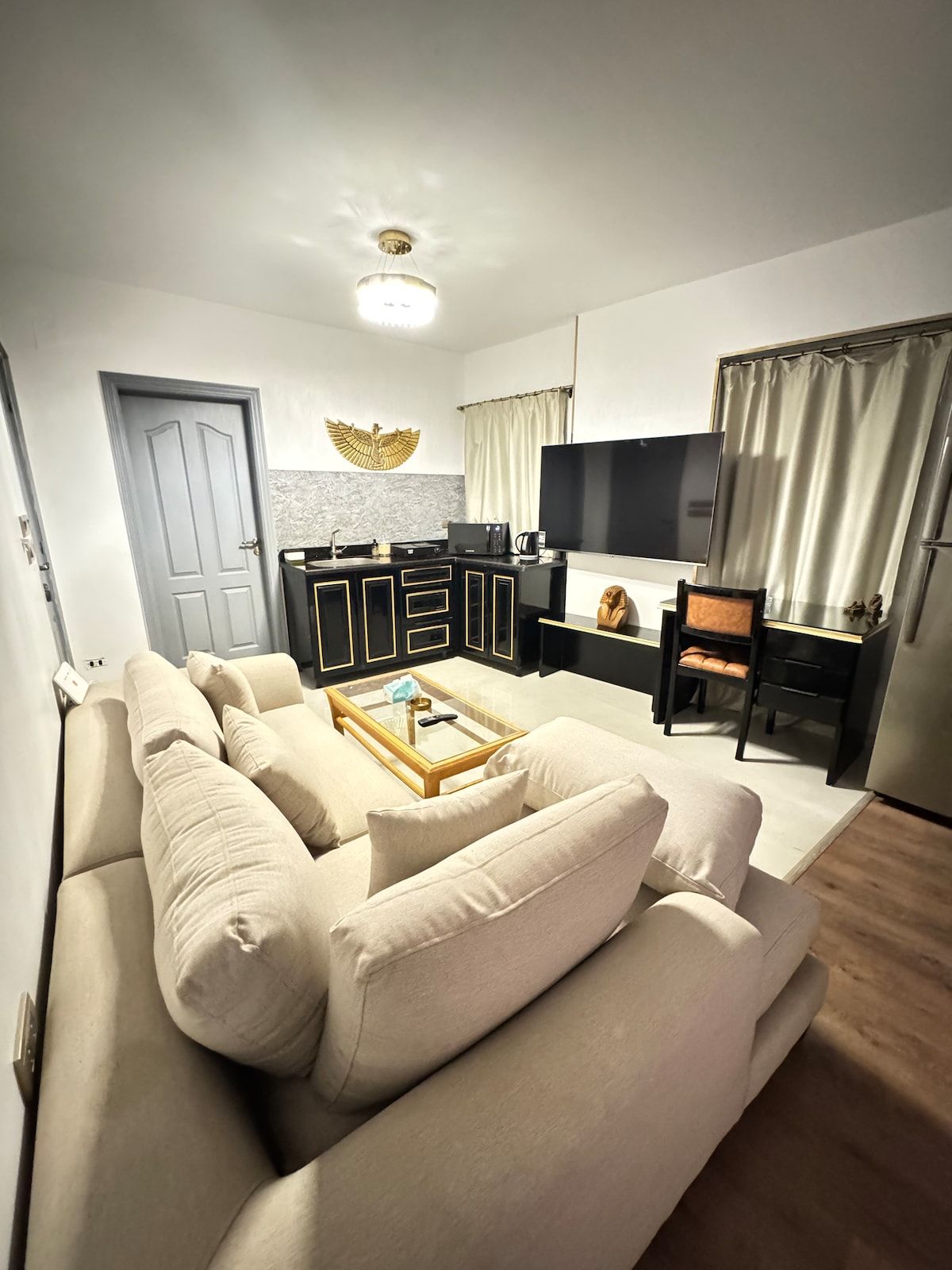 Disfruta de una experiencia elegante en este lugar céntrico. Este diseño único de estudio está inspirado en la belleza de la mariposa🦋. Te da calma, comodidad y alegría. Está a 20 minutos del aeropuerto de El Cairo, a 10 minutos del centro comercial Cairo Festival y a 15 minutos de City Stars. Tiene cocina completa, internet, Smart TV, aire acondicionado frío y calor... y todos los servicios esenciales que hacen que te sientas como en casa. Mi familia y yo esperamos veros pronto. ☺️