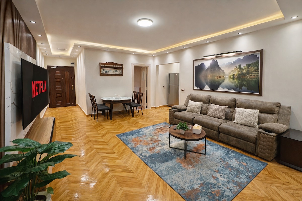 Qué ofrece este lugar • 🛏️ 2 dormitorios (1 principal con baño) + sofá cama • Capacidad para 6 huéspedes • ✨ Cómodo y con acabados modernos • ❄️ 3 aires acondicionados fríos y calientes + electrodomésticos nuevos • 📺 Smart Google TV de 65 pulgadas • 🌐 Internet de alta velocidad de fibra óptica • 🍽️ Cocina pequeña totalmente equipada • 🛋️ Gran sala de estar y comedor • 📍 A 3 minutos de Suez Road • A 8 minutos de Madinaty y Open Air Mall