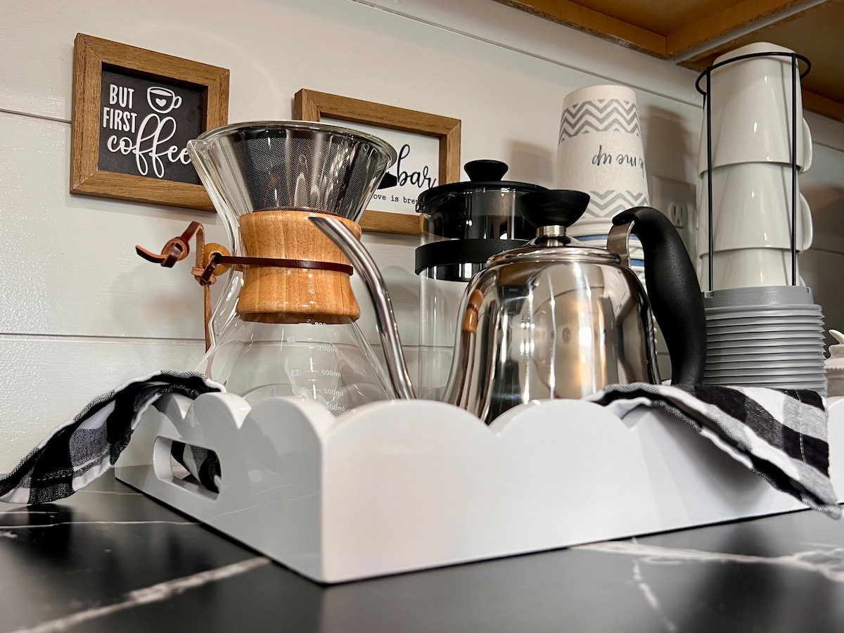 El objetivo es que te relajes, recargues las pilas, disfrutes y respires. Ofrecemos un JACUZZI privado para 3 personas, ducha caliente al aire libre de temporada y chimenea, SAUNA de infrarrojos, bañera independiente de 72 pulgadas para la mejor experiencia de spa. Cama tamaño king con base ajustable y vibratoria. La acogedora casa de 600 pies cuadrados está equipada con todo lo que tu corazón pueda desear. Diseño artístico en cada esquina. Columpios bohemios en el porche privado. Colindamos con un terreno conservado de 13 acres con rutas de senderismo y paseo en el patio trasero.