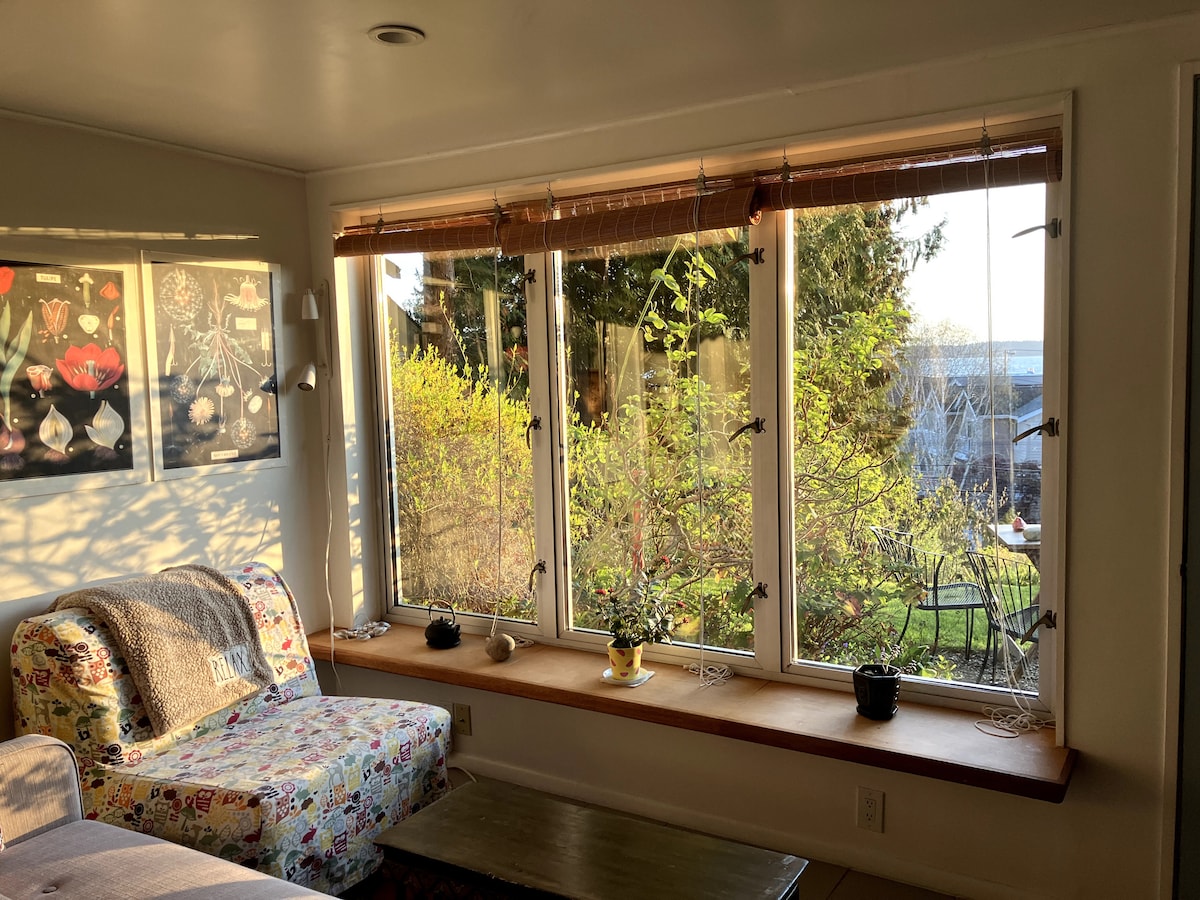 Stay in the cloud canopy with a best friend or someone you love. Natural light from six skylights makes this space like a deep breath. Watching the treetops or clouds pass in the skylights relaxes everyone. Walking distance to coffee, lunch, and dinner. Or make drip coffee in your floating canopy - a space sure to bring about conversation and intimacy. If you need some time away from it all come to stay on your own: meditate, sleep, walk, have tea or catch up on all of your streaming. Upstairs.