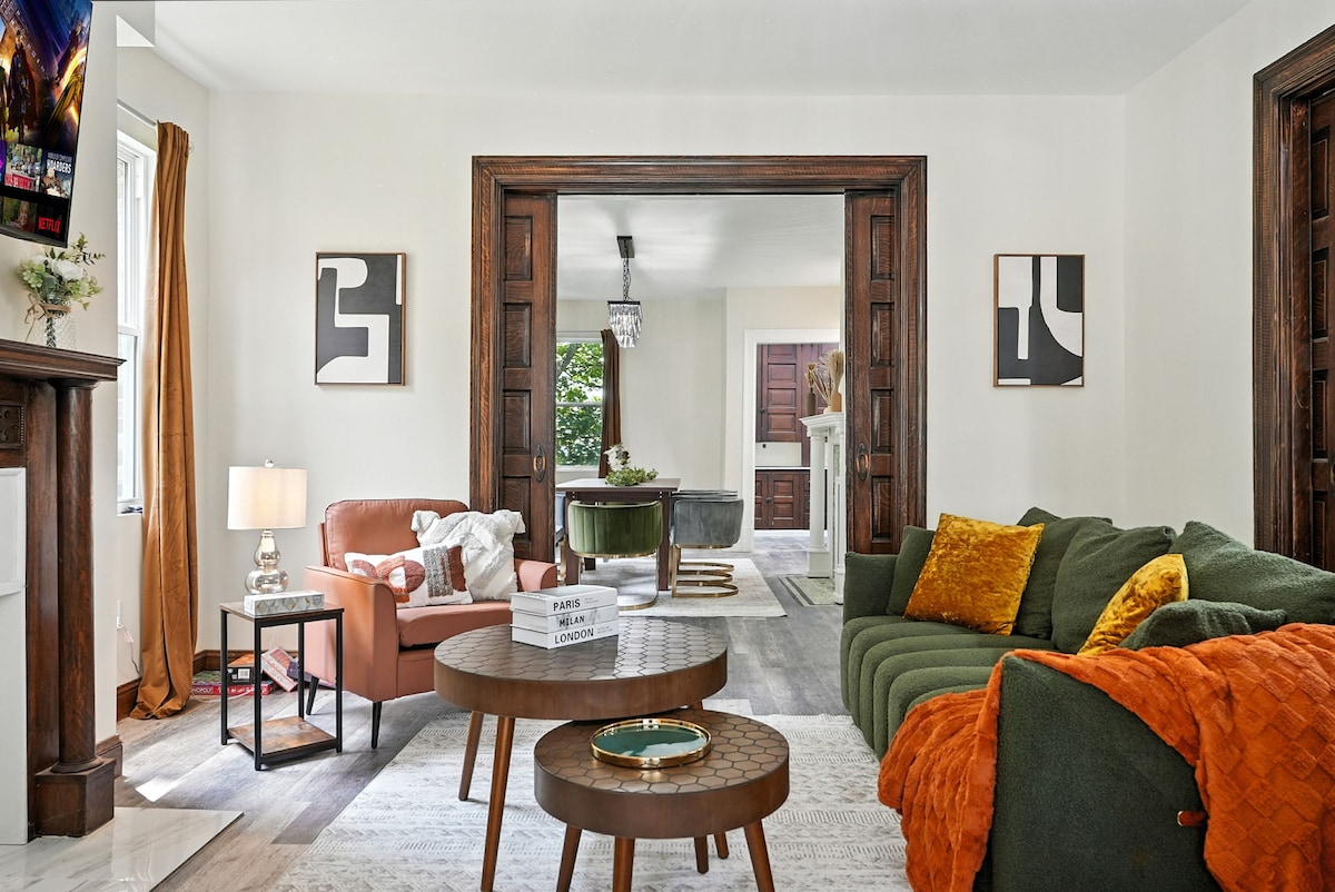 ✨ Walk in and say “woah!” ✨ A restored 1900s farmhouse-style row home with original wood floors, high ceilings, & design that pops. Enjoy two outdoor spaces, including a private deck with outdoor dining + grill, then unwind in the open living room/kitchen with a well-stocked setup, quality beds, and thoughtful amenities. Fast Wi-Fi and workspaces make longer stays easy. Three bedrooms on the 2nd floor, plus a 3rd-floor projector-style theater room. Kid-friendly and great for families or friends.