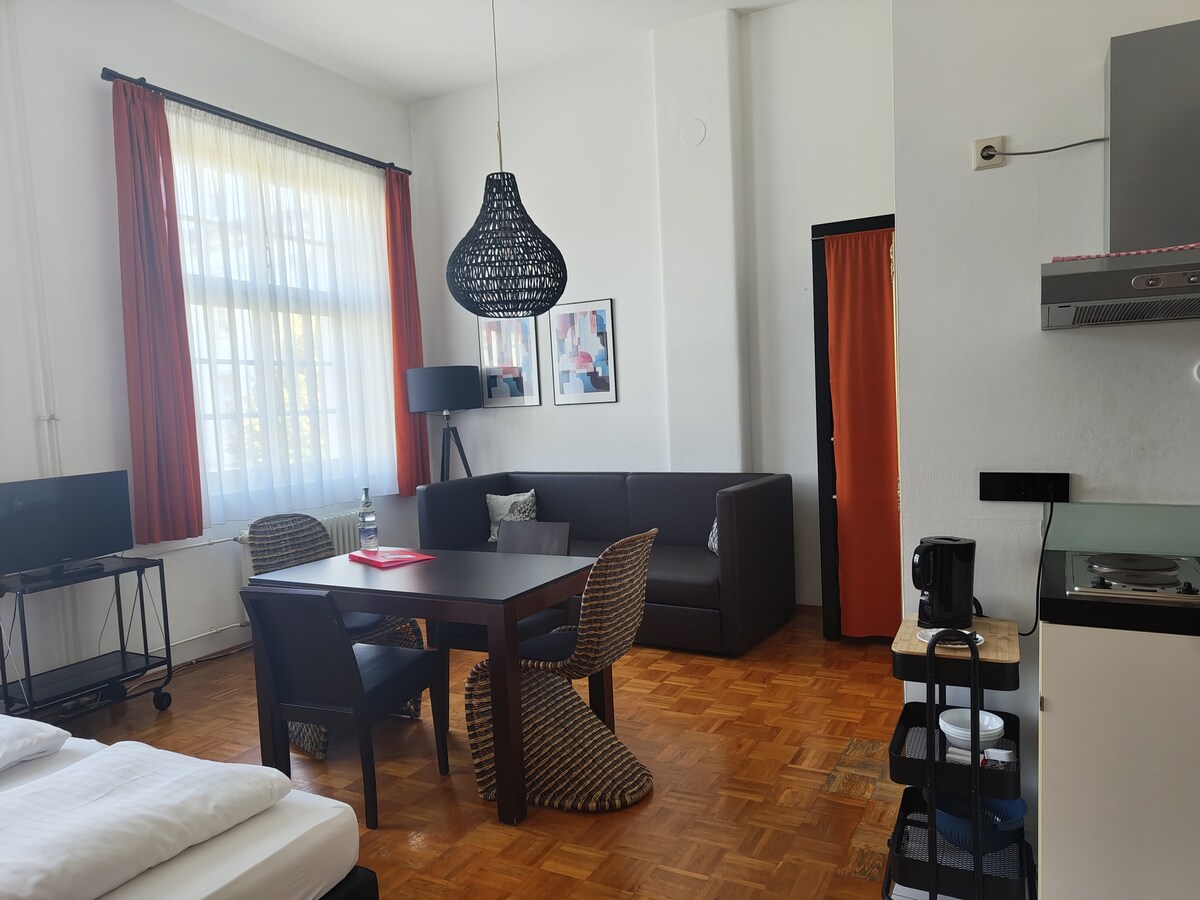 Bienvenido a nuestro encantador apartamento estudio, ideal para parejas o amigos. Ubicado en un antiguo hotel, el apartamento ofrece una cama cómoda, un gran sofá cama y una mesa de comedor. La cocina pequeña está equipada con nevera y placas calefactoras. El baño tiene inodoro y bañera/ducha. Aparcamiento privado disponible. La ubicación es excelente: a solo 10 minutos a pie del Rin y a 20 minutos del centro de la ciudad. Esperamos con interés tu visita.
