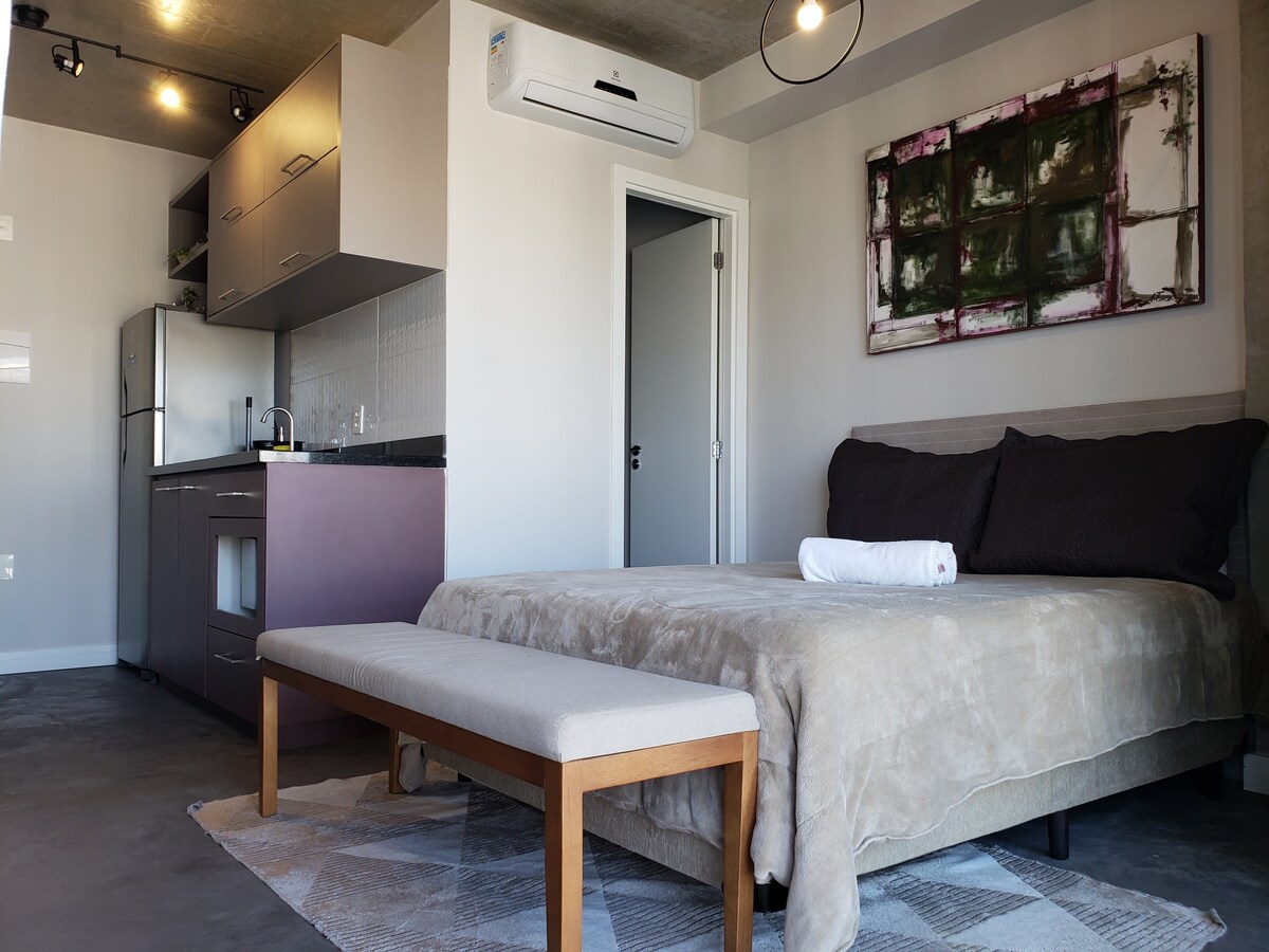 Estudio 40011: a 4 minutos de Allianz Park. Estudio compacto, moderno, completo y cómodo en una de las regiones más culturales de São Paulo. 📍 Rodeado de cafeterías, restaurantes y espectáculos. Aquí late la ciudad ✨ Cama acogedora, encimera, armario, aire acondicionado, TV y cocina equipada con sandwichera, freidora de aire, cafetera, fogones y nevera. 🚿 Baño privado e iluminación acogedora. Con ese rollo de «quiero quedarme un poco más» Perfecto para disfrutar, descansar o trabajar. ¡Reserva ahora!