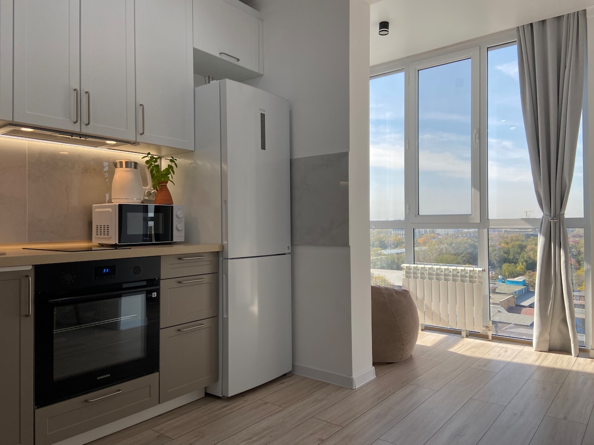 Дофаминовая квартира в центре города! Отличное место для комфортного проживания: • Просторная и светлая гостиная с высокими потолками. • Оборудованная кухня для тех, кто любит готовить. • Уютная спальня с шикарным видом на город. • В нескольких минутах пешком — магазины, кафе и рестораны, парки, пешеходные улицы. Мы создали это пространство, чтобы вы чувствовали себя как дома, а городской ритм был всегда рядом.