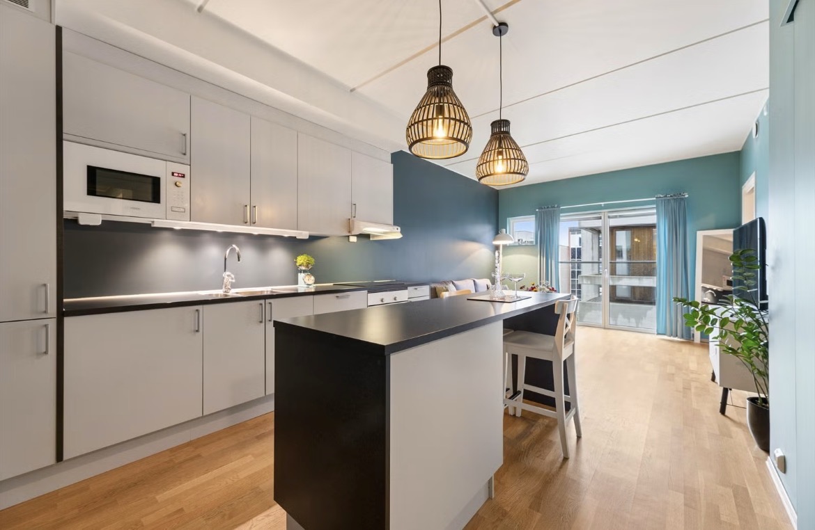 Blåhuset. Departamento peatonal en una calle tranquila.