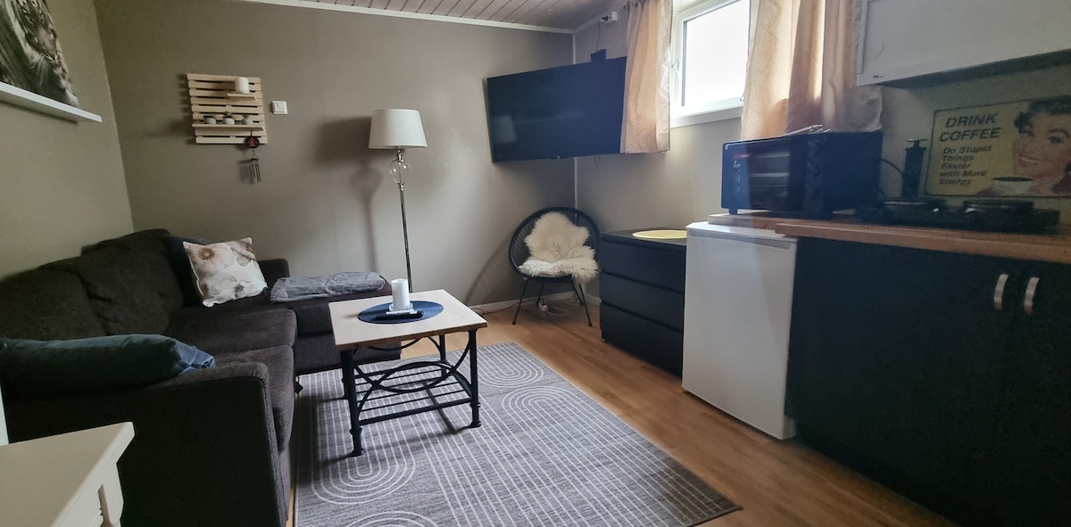 Amplio estudio de 40 kvm ubicado a 3-400m del centro con tiendas, parada de autobús y todo lo necesario. El estudio contiene una habitación y un baño grande. Tu propia entrada y estacionamiento. La habitación tiene 2 camas y una cama plegable. También hay un sofá y una mesa, y algunas sillas. Hay caldera de agua, nevera y café/te/tazas disponibles. Amplio baño con ducha, lavadora y accesorios de baño nuevos. No hay cocina, pero obtienes comida caliente a poca distancia a pie. ¡Privacidad! :)
