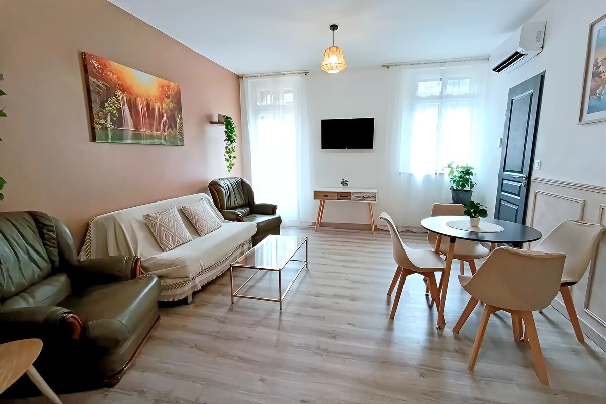 Apartamento con aire acondicionado F2 40m2 2* con jardín ds villa, hermosa vista de las montañas y la ciudad, los primeros y últimos rayos de sol, a 5 minutos a pie del centro y a 10 minutos de las termas...... Plaza de aparcamiento.....Cerca de la piscina municipal, salida de senderismo, marcha nórdica, carril bici. Cocina equipada, sala de estar, sofá cama, wifi... Dormitorio con cama y muy buen colchón 140x200... baño... WC independiente.... Gran armario... Lavadero: lavadora, tabla y plancha.