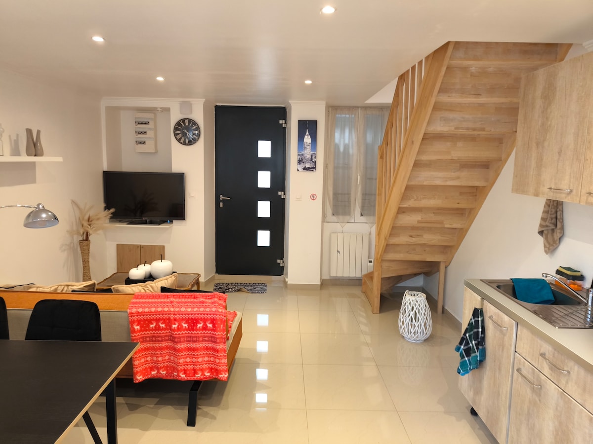 Maison de ville d’environ 50m2 disposant d'une pièce de vie ouverte avec salon, cuisine et salle à manger ; une chambre avec un lit Queen size (160x200), une seconde chambre avec un lit 1 personne (90x190) avec penderie et bureau ; une salle de douche avec sanitaire. Emplacement géographique idéal, elle est située à 1,5 kilomètres du centre ville d’Angoulême. Linge de lit et de toilette fournis pour le séjour.