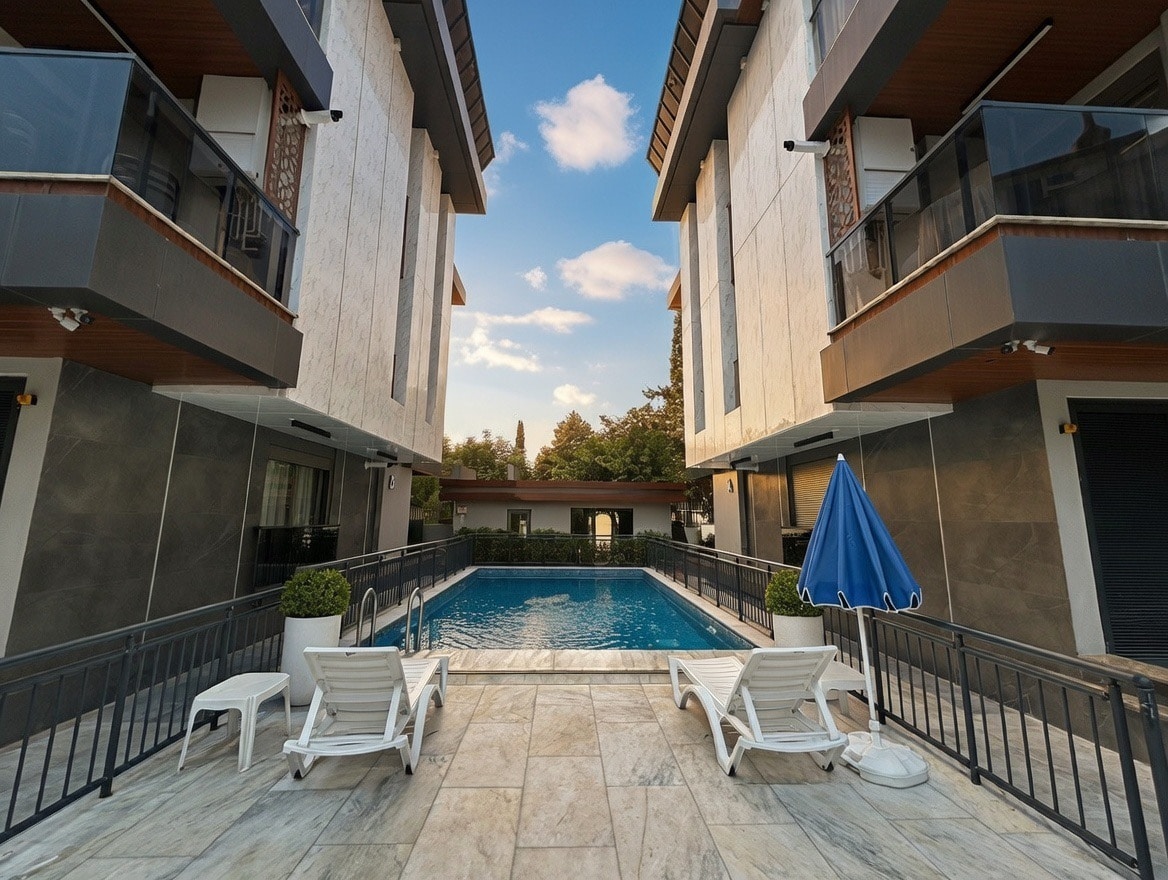 Llega a las aguas turquesas con un paseo mágico de 5 minutos en Konyaaltı. La frescura y la libertad de la playa te esperan. De regreso a casa, su recompensa está lista: refrésquese en la piscina de cristal de nuestro sitio o mire la puesta de sol con la paz del jardín en la terraza solárium. La comodidad está en el nivel más alto en tu elegante apartamento 1+1. Disfruta de sillones suaves, un televisor inteligente y una cocina totalmente equipada. Sal al balcón y deja que la brisa mediterránea se lleve todo el cansancio. ¡La vida es mucho más agradable aquí!