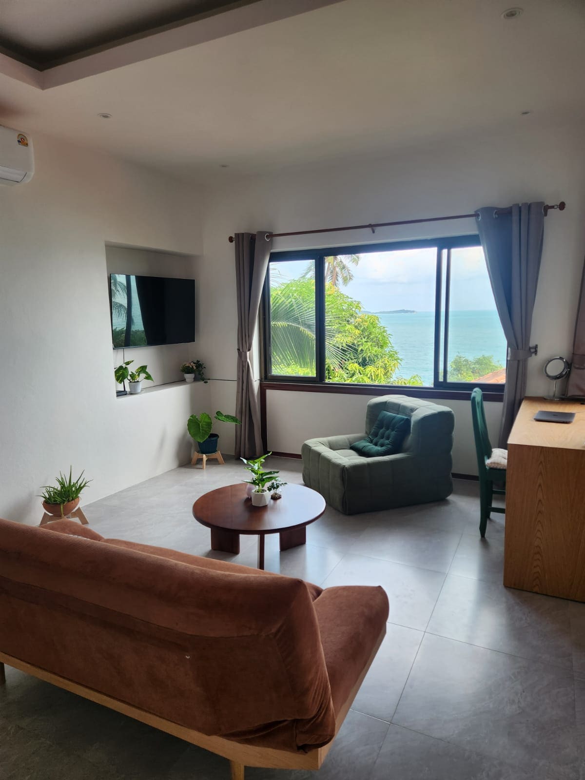 El apartamento de 130 metros cuadrados tiene 2 habitaciones., salón con cocina americana, 2 baños, TV LED 50", conexión por cable, caja de televisión y wifi. Tiene una terraza de 32 metros cuadrados cubierta y una terraza solárium de 25 metros cuadrados con ducha de efecto lluvia. Ambas con fascinantes vistas al mar. Se proporcionan nevera y utensilios de cocina. Disponemos de limpieza adicional. Se ofrece una piscina comunitaria infinita con hermosas vistas al mar, una sala a la sombra para relajarse y un tradicional masaje tailandés. Está a 5 minutos a pie de la playa de Lamai .