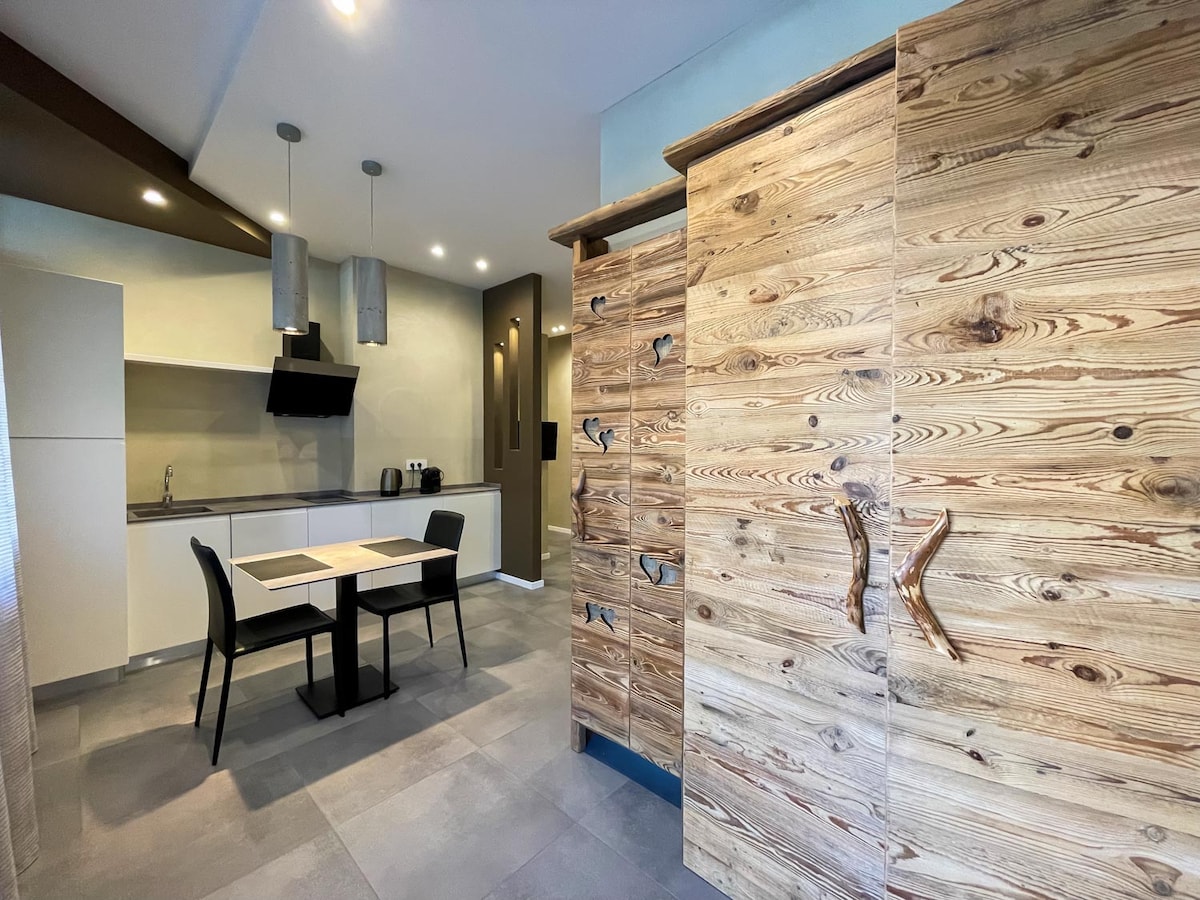 Apartamento recién reformado - dos habitaciones de diseño abierto con mobiliario moderno y cuidados detalles en madera para hacerte sentir un poco el aire de la montaña en un interior completamente nuevo. Hemos preferido una decoración minimalista pero con todo lo que pueda servir para su estancia, en el interior hay espacio para el almacenamiento de su equipo de esquí más una sala dedicada con la bicicleta de spinning y algunos pequeños equipos deportivos para su entrenamiento incluso en vacaciones.