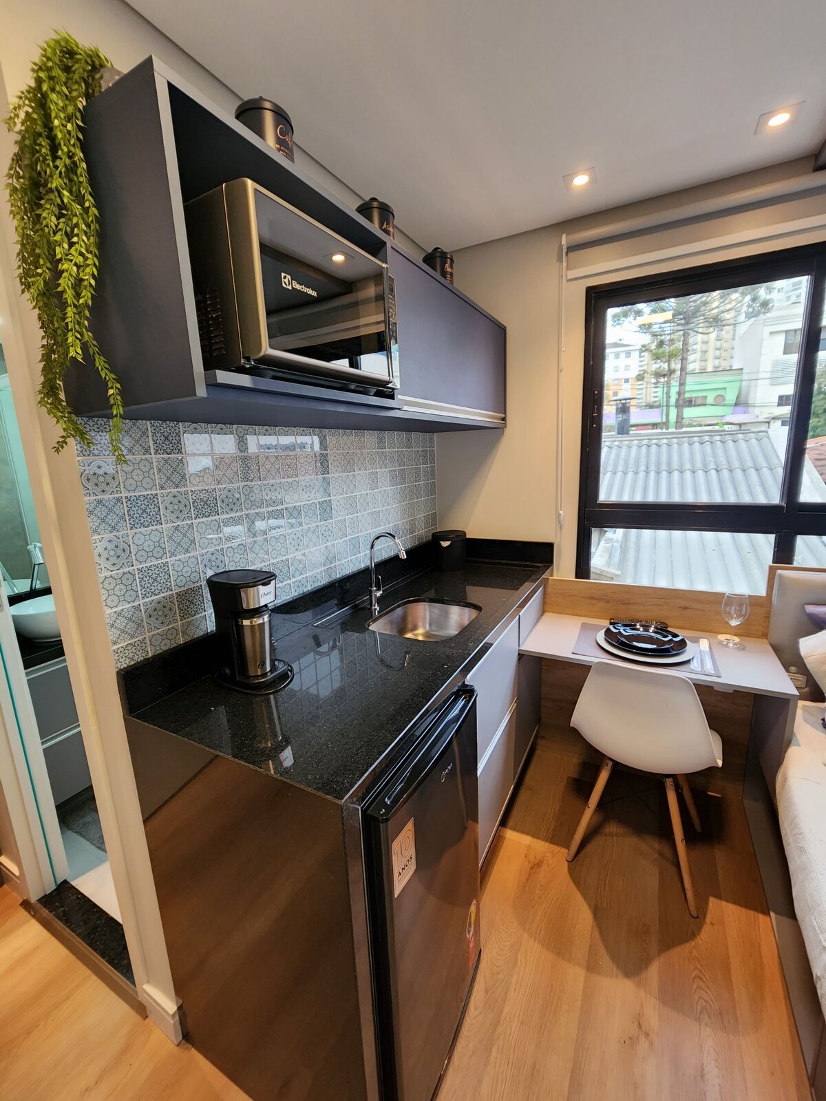Moderno estudio, en el Centro Cívico, ideal para aquellos que buscan comodidad, practicidad y una excelente ubicación en Curitiba. Ambiente con aire acondicionado, cocina equipada y Smart TV, perfecto para el ocio o el trabajo. 🛏️ Con capacidad para 4 personas, ropa de cama de calidad. • Piscina climatizada. • Gimnasio • Sauna • Terraza • Lavandería (de pago) ⚠️ Para el uso de la piscina, el condominio requiere la presentación de un certificado médico. 🚗 Estacionamiento disponible en el edificio, R$ 35 por noche Pagado a través de PIX al anfitrión.