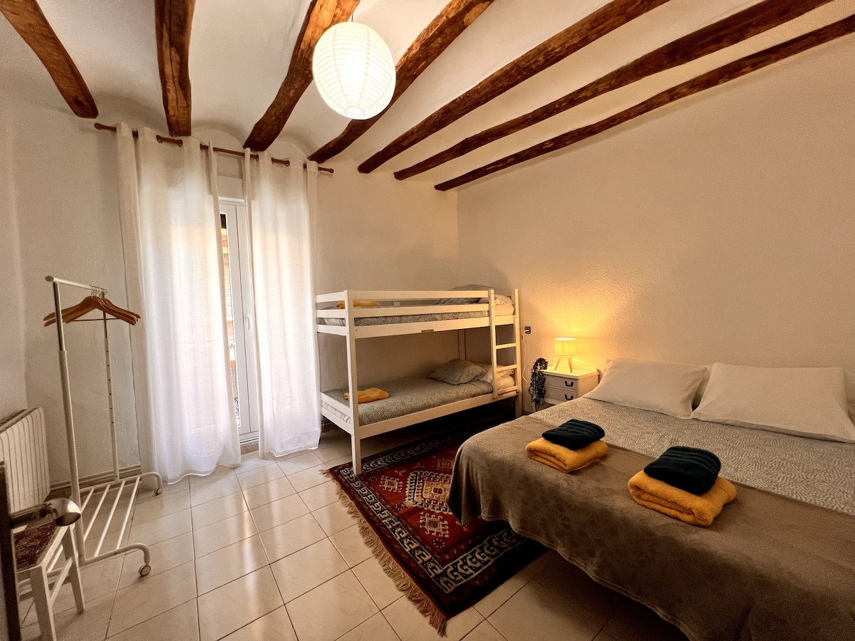 Original apartamento decorado en ambiente rústico, pero con todas las comodidades actuales. Dispone de salón, cocina-comedor, despensa, baño completo y en la parte de arriba dos habitaciones muy originales, separadas por un espacio y cortinas, sin pared Ideal para una familia con niños.