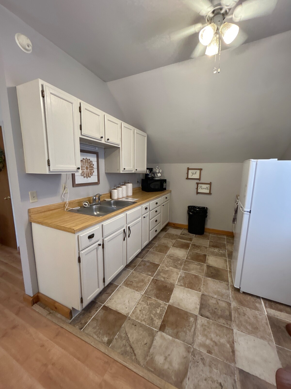 Contempla el impecable ayuntamiento con la Estatua de la Libertad y una escultura de bronce que marca la ciudad donde el Honesto Abe visitó justo antes de anunciar su candidatura a la presidencia. Los ladrillos originales y la madera de esta casa única de 170 años han sobrevivido al paso del tiempo. Sube en ascensor (o por las escaleras) hasta el segundo piso. Situado en el corazón del centro histórico de Leavenworth, la primera ciudad de Kansas. A pocas manzanas hay varias cafeterías, panaderías, boutiques y bares. Ubicado a solo 10 millas de la galardonada ciudad turística de Weston, que tiene muchas cervecerías, bodegas y rutas de senderismo. ¡No encontrarás esto en ningún otro lugar! Suelos originales y amplios pisos de madera que se colocaron hace 165 años y paredes de ladrillo originales que han resistido el paso del tiempo. Una vista desde nueve ventanas que dan a nuestro prístino ayuntamiento con la estatua de la libertad y la estatua de Abraham Lincoln. (¡Lincoln anunció su candidatura a la presidencia allí mismo en Leavenworth!) ¡Y pensar que lo más probable es que cruzara la calle y entrara en nuestro edificio, ya que era un salón en ese momento! Entrarás en nuestro loft desde la calle mediante un teclado y hay una pequeña habitación que conduce a nuestro nuevo ascensor (gran puerta de acero) para llevarte al segundo piso. Las instrucciones para el ascensor están en la pared. Muy fácil, solo cierra siempre la puerta blanca de acordeón del ascensor en caso de que tu grupo lo llame desde otro piso. Tu grupo es la única persona que tiene acceso a este ascensor. La hora de llegada es entre las 16:00 y las 19:00 horas. Envíanos un mensaje de texto si no es en ese plazo. La salida es a las 11:00 h. Una vez más, ¡envíanos un mensaje de texto si necesitas más tiempo! Mac y Stacy siempre están a solo un mensaje de distancia y pueden estar allí en 10 minutos. #913-651-7798. ¡Envíanos un mensaje de texto si tienes alguna pregunta! Sube en un ascensor personalizado al espacio abierto pero acogedor sobre la boutique de velas y regalos del anfitrión. El apartamento es una base estupenda para explorar Kansas City, Fort Leavenworth, la sede del condado y la pintoresca Weston, Missouri. Tiendas, restaurantes, cafeterías y bares están a solo unos pasos. Hay un gran aparcamiento detrás del edificio en la calle 5. Televisor de 65 pulgadas, pero no tenemos cable. Hay un reproductor de DVD y puedes conectar tu teléfono al televisor para ver tus vídeos, Hulu, etc. ¡Eso es lo que hacemos, y usamos los datos de nuestro teléfono u ordenador para mostrarlos en la pantalla del televisor!