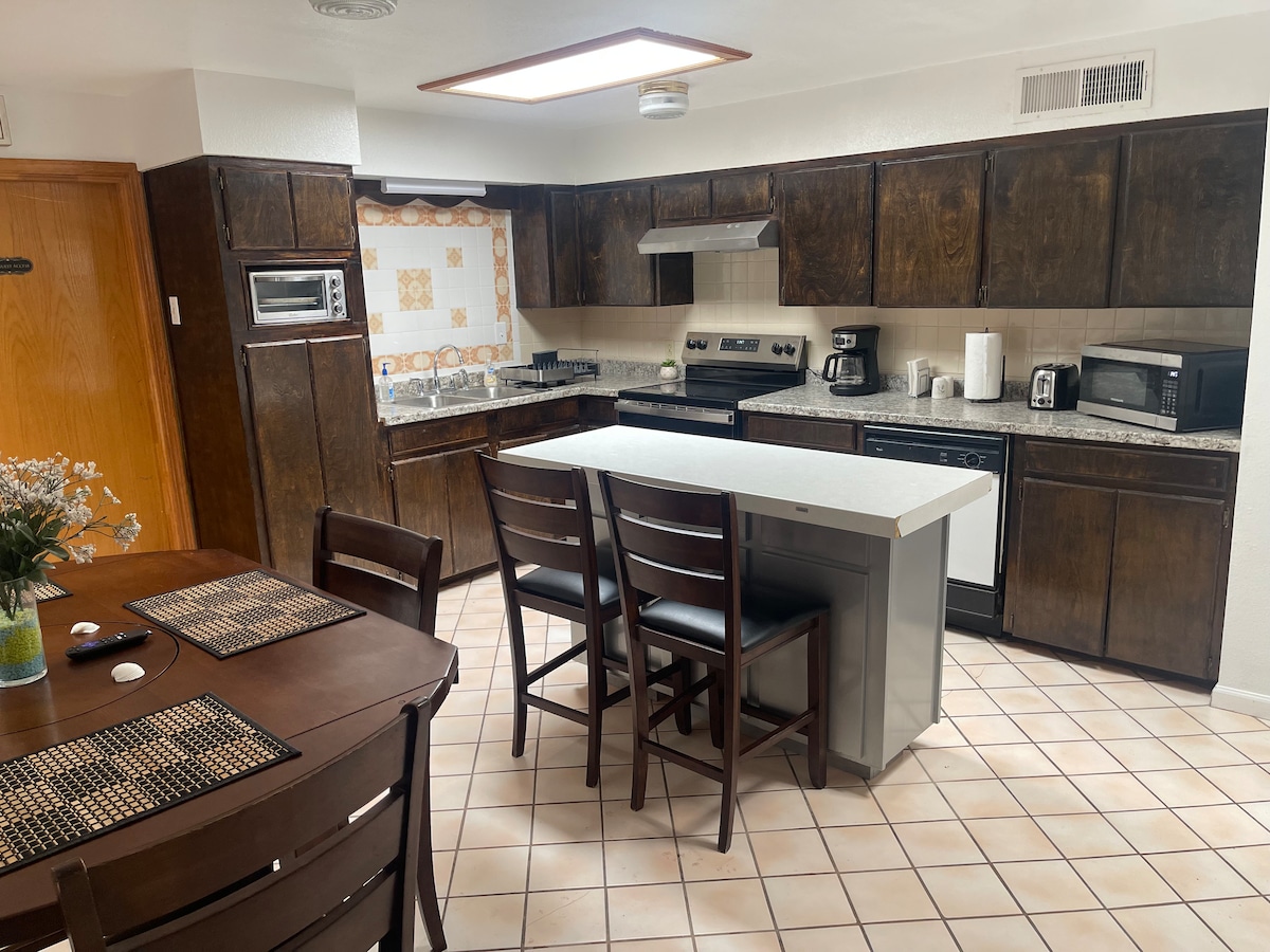 1 bedroom -Queen bed, 1 bath, couch, kitchenette, courtyard. Brand new 55" smart TV, high speed Wi-Fi. Studio located in West El Paso close to I-10. The Kitchenette is equipped with refrigerator, microwave, convection toaster oven, coffee maker, double burner electric cooktop, blender, 2 slice toaster, cooking ware, plates, cups, glasses, silverware, etc. High chair and pack'n play are available upon request.