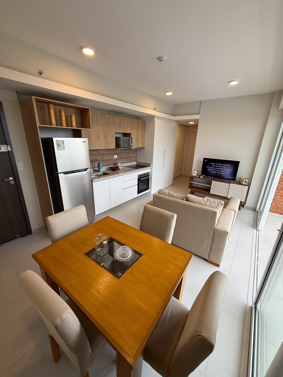Hermoso y acogedor departamento en un edificio residencial, situado en un barrio muy concurrido con grandes centros comerciales y variedad de restaurantes. Ideal para moverse caminando. Relájate y disfruta de una hermosa piscina en la terraza del edificio, y de un completo gimnasio. El departamento está completamente equipado para 4 personas, tanto para estadías largas como cortas. Tiene 2 habitaciones, un baño completo y un baño social, cocina completa, living comedor, y balcón. Enjoy!