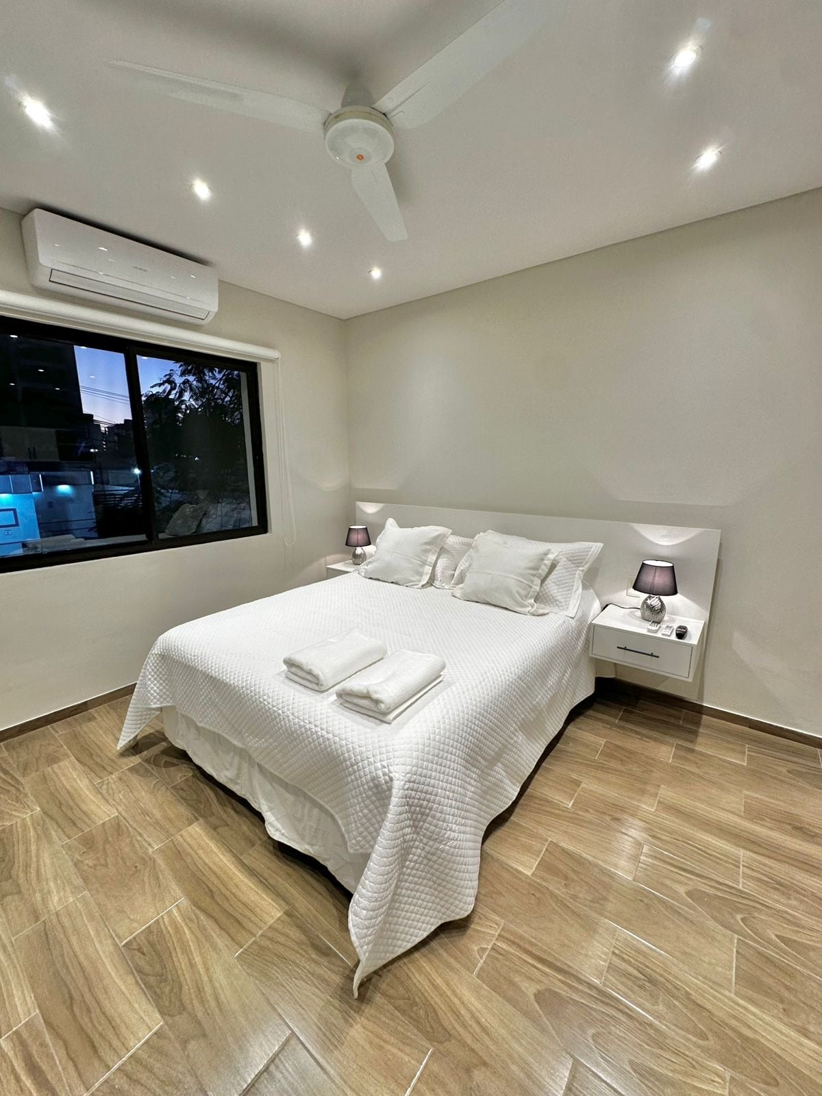 Departamento nuevo a estrenar en edificio lujoso. Tiene 40m² propios, con Smart TV, WIFI, y en el edificio tenes todos los amenities: Piscina , Quincho climatizado con parrilla, Sala de juego de niños, gimnasio equipado, etc Queda a 5 minutos en auto del centro corporativo mas valorado de la capital, y a 25 minutos caminando. Tambien queda a 11 minutos en auto al aeropuerto Silvio Pettirossi Tiene una cama matrimonial + un sofa cama. En total se pueden hasta 3 personas para dormir.