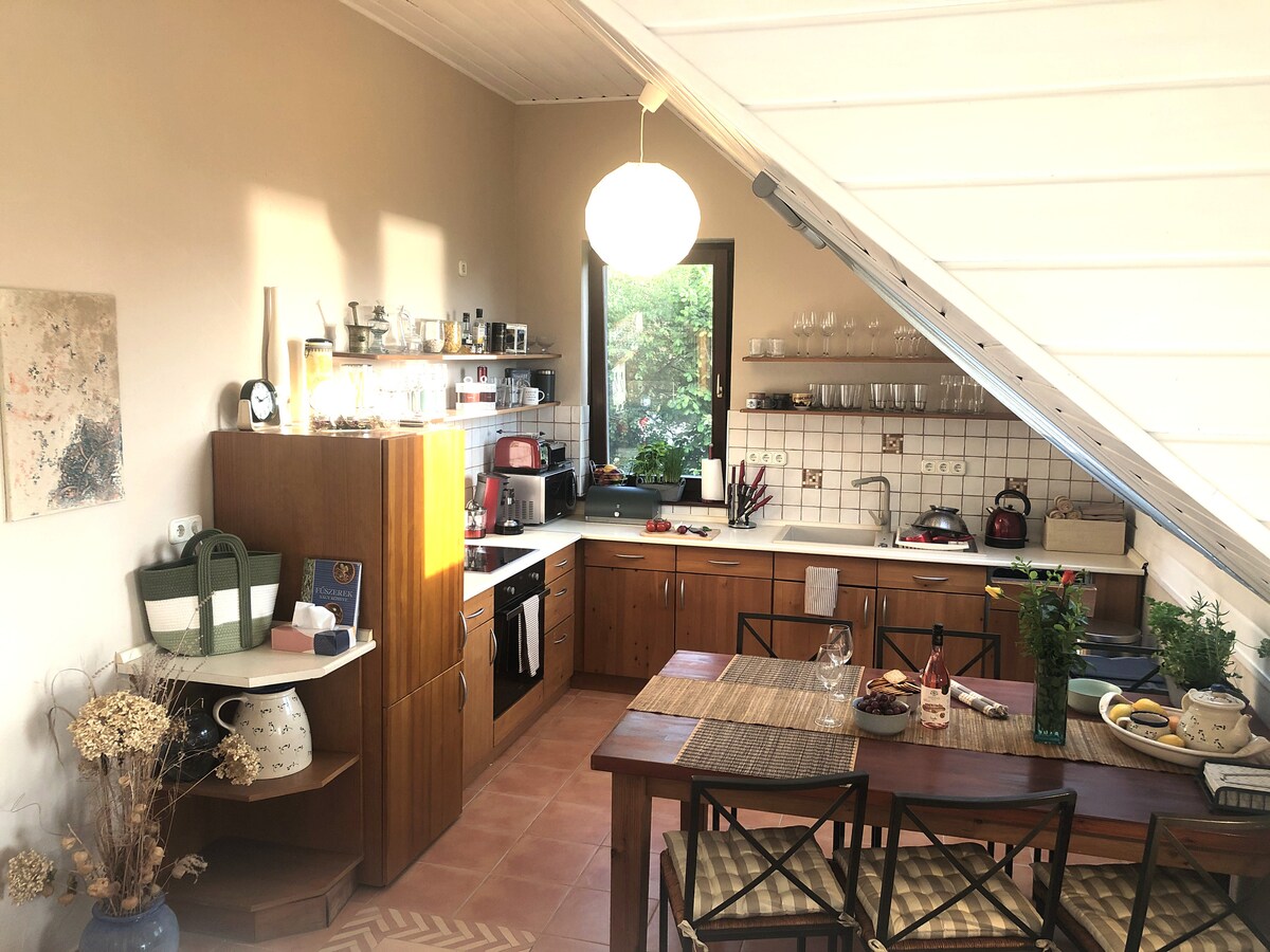 Örvényes is a wonderful place to retreat yet close to the beach, Tihany, market, restaurants etc. The house is top of the hill, where it's wonderful view to the Lake Balaton, Tihany and Sajkod bay. A dirt road leads to the garden, where there is no fence, wild animals (boar, deer, fox, rabbit,pheasant) are regular visitors to the garden at dawn. the house was built on a 300-year-old cellar, a stylish bathroom and room were designed in the basement.