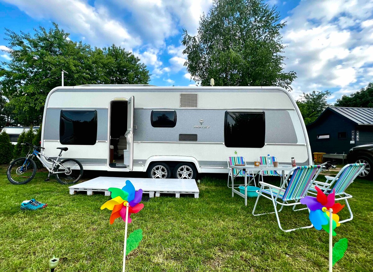 El remolque está en un pintoresco centro vacacional en el lago White Augustów. Un remolque es un Mercedes entre los remolques: - Hermosamente terminado - pieles blancas - tiene un bar, una estufa, un microondas, un televisor y un wifi. - cama doble y litera: la alquilamos para un máximo de 5 personas. - Sábanas frescas disponibles en el remolque. - Los huéspedes pueden utilizar nuestras 2 bicicletas de montaña. Además, en Però: - esquís acuáticos - lanchas - bádminton, voleibol, fogata, bania - restaurante