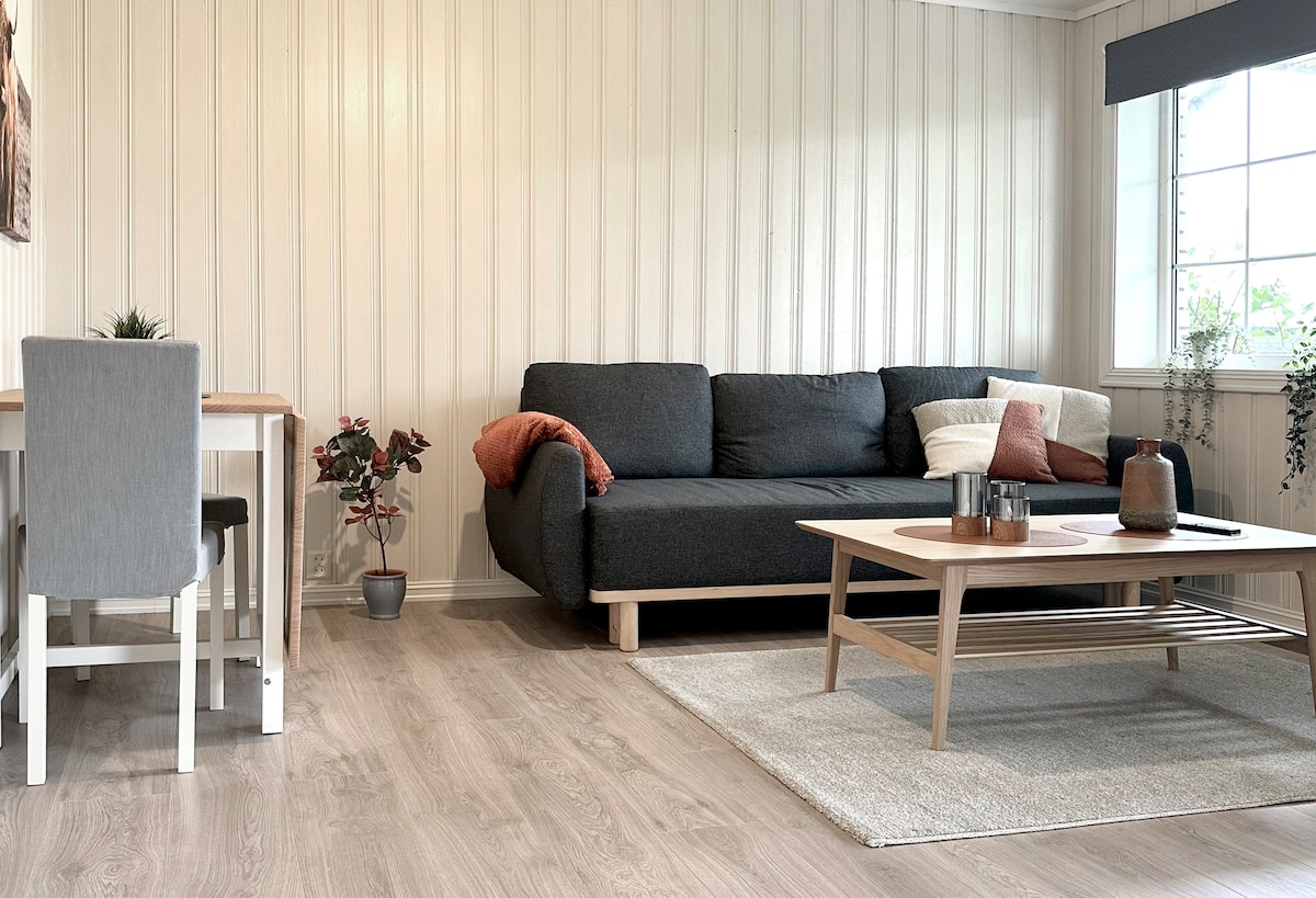 Acogedora casa de campo con dos dormitorios y excelentes vistas al mar. A 3 millas de Molde (ciudad de rosas). A 30 minutos de Atlantic Road , a 10 minutos del pueblo pesquero Bud, a 15 minutos de Trollkirka. Gran ruta de senderismo cerca, a pocos pasos del departamento . Aproximadamente a 1 km de la tienda de comestibles más cercana.