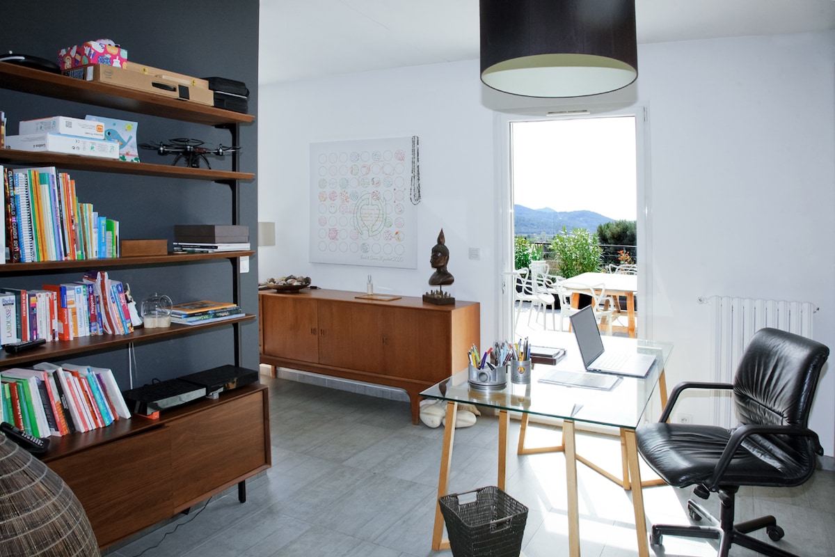 Villa de arquitecto en una zona tranquila situada en el campo de Aix al pie del magnífico sitio de la Sainte Victoire. ¡Nueva piscina climatizada! A 5 minutos en auto de Aix en Provence y a 45 minutos de las playas. De estilo contemporáneo, construido con materiales y en un entorno de calidad, la villa tiene capacidad para 4 personas cómodamente. Para las familias con bebé, encontrará cuna, silla alta, caminar, reductor de inodoro, tumbona, juguetes y bañera de bebé (sin cabecera).
