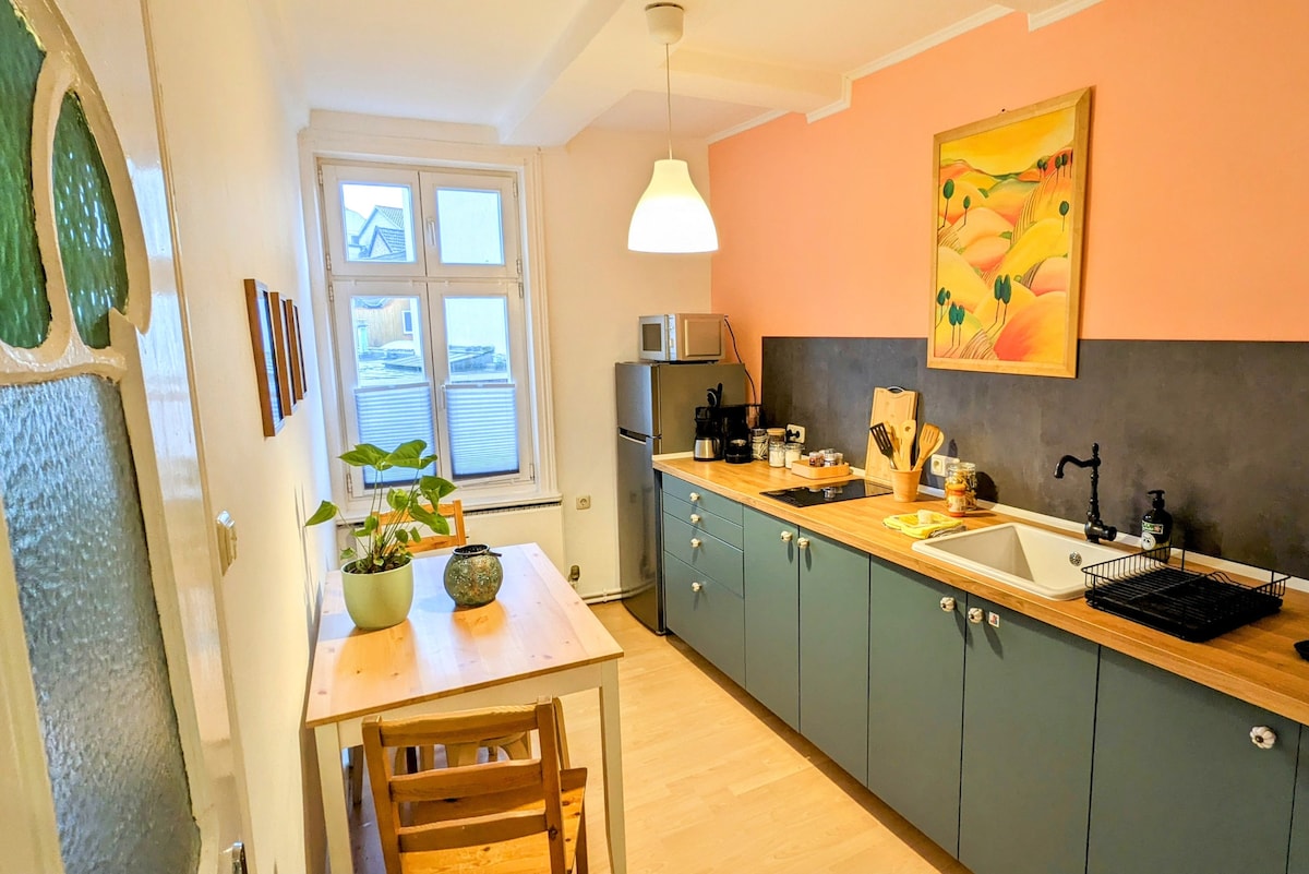 Un apartamento de 40 metros cuadrados para no fumadores te está esperando. Todo está recién reformado. El fino carácter histórico se ha conservado maravillosamente. La cocina está totalmente equipada con café y té, especias, papel de aluminio y moldes para hornear. Por así decirlo, los utensilios de cocina propios pueden quedarse en casa. Aquí hay TODO lo que necesitas para vivir.