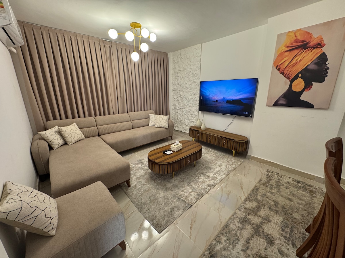 Un elegante refugio retro de dos dormitorios en Privado, la comunidad privada de Madinaty. Diseñado en refrescantes tonos menta y ámbar cálido, cuenta con un gran jardín privado, tres cómodas camas y una amplia sala de estar con una gran televisión inteligente. Perfecto para familias que buscan comodidad y tranquilidad, con cafeterías, parques y el centro comercial al aire libre a pocos minutos, donde el color, el espacio y la serenidad se encuentran.