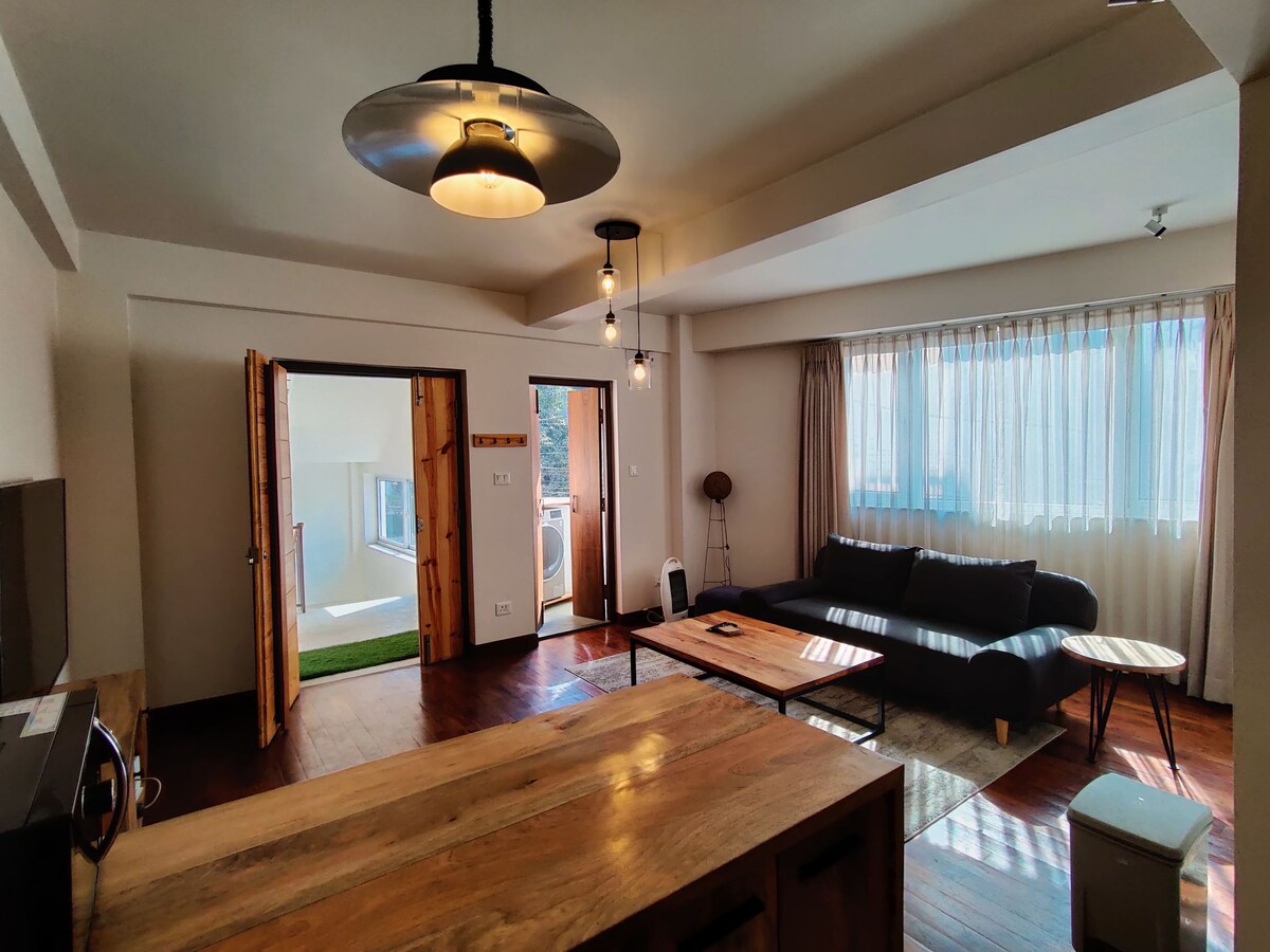 Located right at the city's heart Lazimpat, the apartment is still hidden amongst the greenery and quietness. Modern, well-designed layout, minimal interiors with well-furnished modular furniture in a 1600 sqft apartment has a spacious living and dining room, 2 bedrooms with ensuite bathrooms, a fully functional kitchen, and a powder room. Enjoy the 360° view of the city from the terrace accompanied by birds singing and lush greenery in the background.