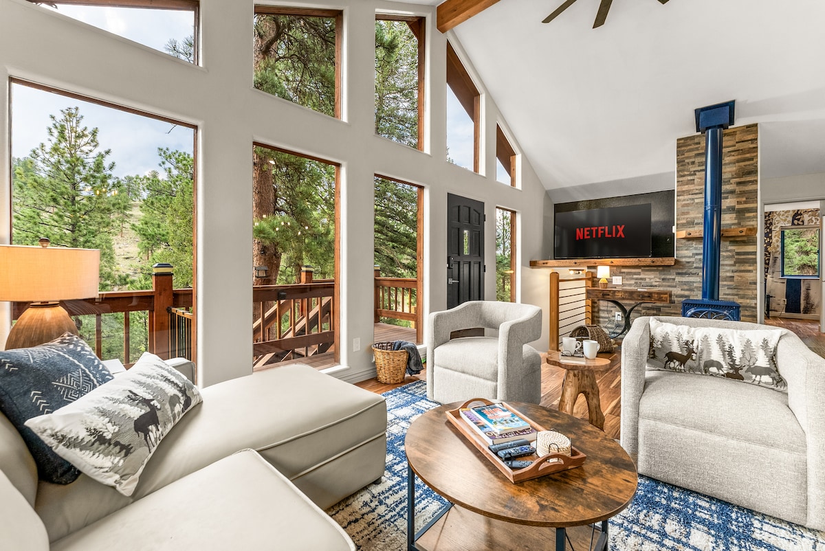 Welcome to The Antler Overlook! Breathe in fresh air around a warm fire while soaking in sweeping mountain views on private 3 acres. Whether you are looking to relax, visit a true mountain town (2 mile drive!), see Red Rocks, ski a popular resort, take a trip to Rocky Mountain National Park, or experience the many outdoor mountain activities, this professionally designed mountain home is ready to meet your vacation dreams!