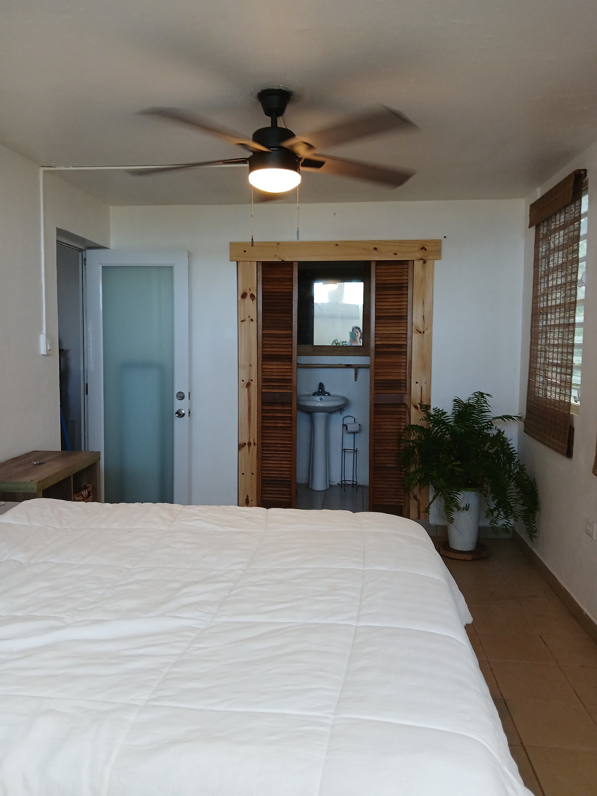 Camina por nuestro camino privado hacia el océano, donde la playa es muy tranquila. Ubicado entre Jobos y Shacks Beach. Gran surf, esnórquel y kitesurf a lo largo de la costa norte. Privado, cerrado, vallado y con mucho aparcamiento. El estudio A en Pedro's Palms tiene aire acondicionado, ventiladores de techo, puertas y ventanas con mosquiteras para disfrutar de la brisa caribeña. Suelos y pasillos de baldosas. Colchones tamaño queen Serta y televisores inteligentes. ¡Cocinas totalmente equipadas para que puedas comer en casa o cenar en restaurantes locales!