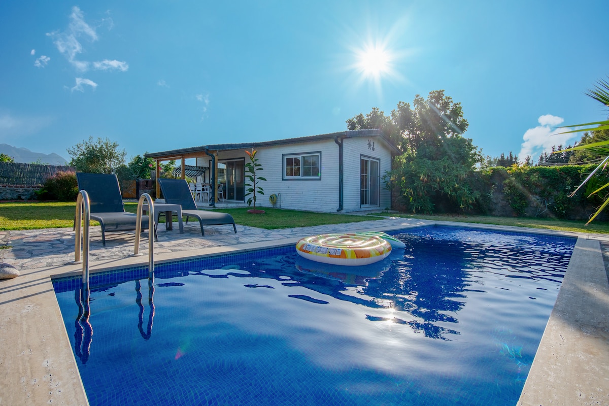 Bungalow único en un tranquilo y relajante jardín ORGÁNICO de naranja y limón. Relájate en un jacuzzi climatizado al aire libre. Por la tarde, paseos al aire libre junto al mar en Akyaka a 10 minutos en coche de la casa, un paseo por el bosque de pinos justo detrás, paseos a caballo en el establo. Por la noche puedes ver tu serie favorita de Netflix. Tienda de gescolar y alcohol a 10 minutos a pie.