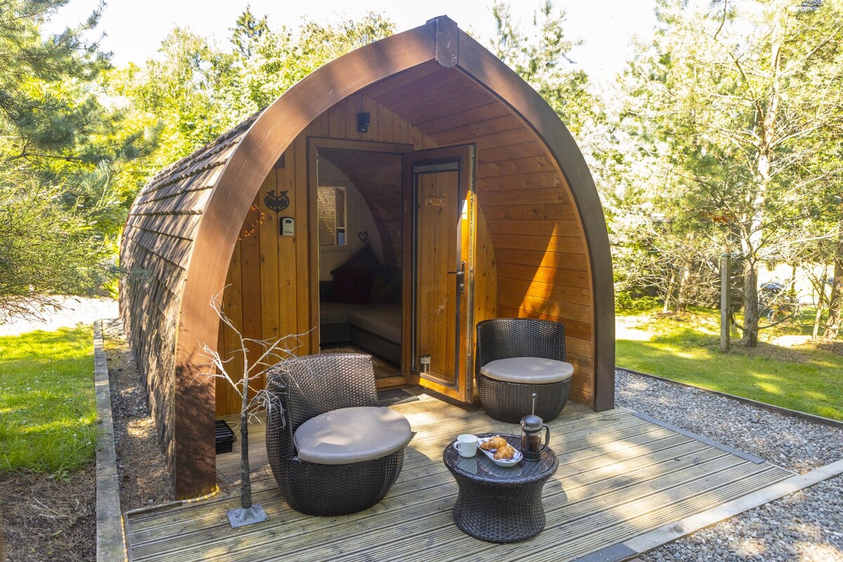 La cápsula Wee Oak Tree es una porción de lujo. Ideal para parejas, la cápsula se encuentra junto al hermoso telón de fondo del bosque. La cápsula de lujo cuenta con un salón, comedor y cocina totalmente equipada con vitrocerámica doble, horno y nevera. El dormitorio doble es servido por un baño con ducha. También te mimamos con artículos de tocador de lujo de Scottish Fine Soaps, toallas suaves y batas de baño. Junto a tu cabaña está tu propia bañera de hidromasaje privada con luces de hadas. Podemos dar la bienvenida a un perro pequeño a Wee Oak Tree.