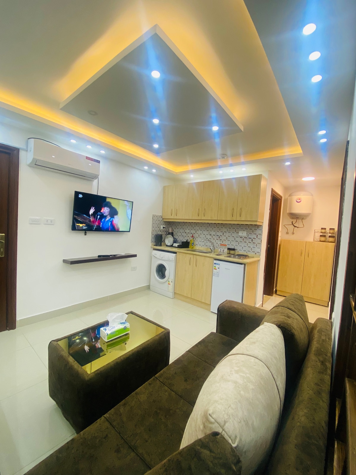 Apartamento de un dormitorio, con cama tamaño king, cocina totalmente equipada y baño moderno, A un minuto a pie de todos los servicios, taxi, supermercado, incluso el gimnasio, Oye, son 5 minutos en taxi al parque empresarial y al centro comercial Macca, no te arrepentirás... Guardia de seguridad 24/7، junto con portero para satisfacer sus necesidades, finalmente servicio de habitaciones disponible bajo petición sin cargo adicional.