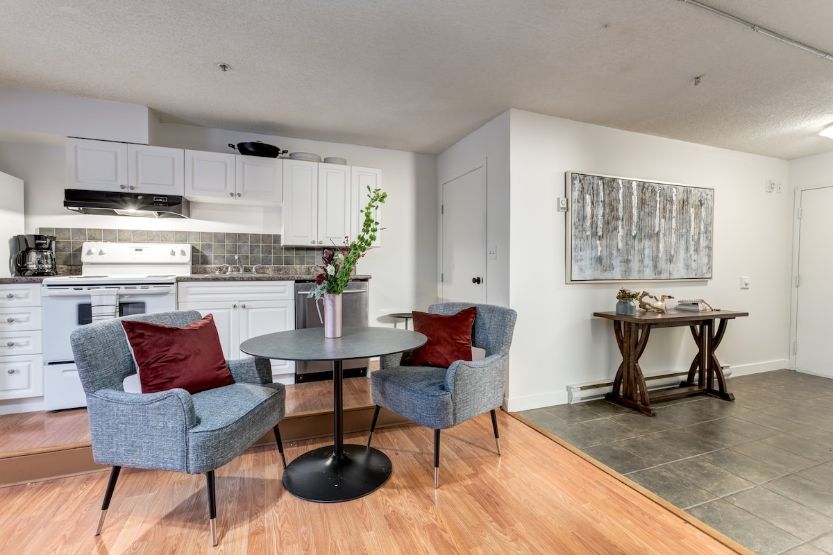 Blue Moose is a newly updated and furnished, spacious luxury one-bedroom condominium with king -sized bed and queen sofa bed. New for 2025: major bathroom and kitchen upgrades. PERFECT LOCATION This modern mountain retreat is situated next to a pristine mountain creek. Follow a creekside nature trail and within minutes you are in downtown Canmore with trendy shops, cafes, food trucks, and both casual and upscale dining.