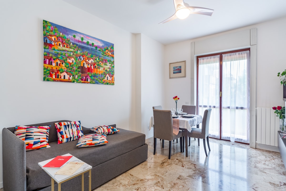 Located in the heart of Rho, Pomè Verde is a modern and welcoming one-bedroom apartment, perfect for visiting Milan and the Rho Fiera exhibition center. It features a living area with a fully equipped kitchen, dining table, and sofa bed, a quiet, spacious double bedroom, and a bathroom with a shower and amenities. Wi-Fi, air conditioning, TV, washing machine, and complimentary toiletries are included.