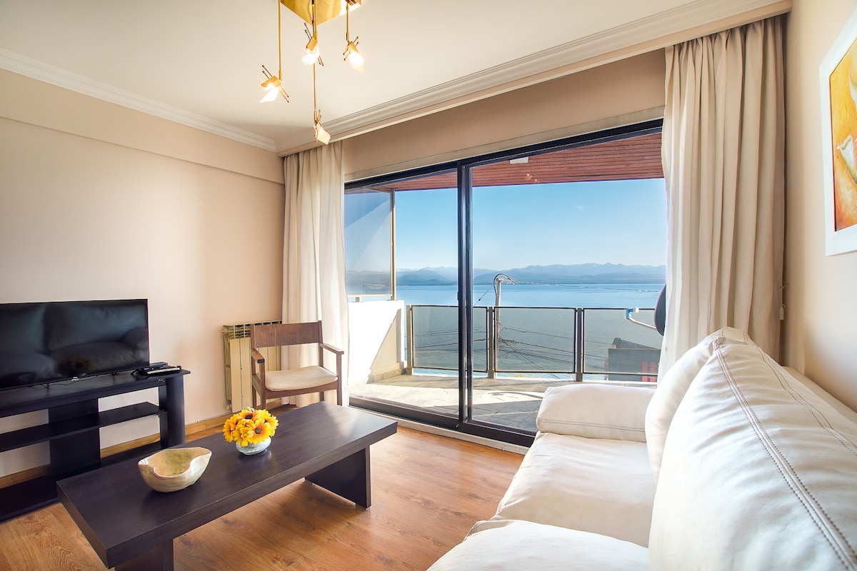 Este lujoso apartamento en la planta superior da directamente al lago y lo tiene todo: amplias vistas panorámicas del lago y la montaña, dos balcones separados, acceso directo a la orilla del lago y wifi rápido. A pesar de estar a solo unos minutos a pie del centro y convenientemente ubicado en la avenida principal junto al lago, el apartamento es tranquilo, silencioso y completamente aislado. Los huéspedes pueden contemplar las vistas a través de la enorme ventana de triple aspecto mientras el sol sale sobre la estepa patagónica y se pone sobre los Andes.