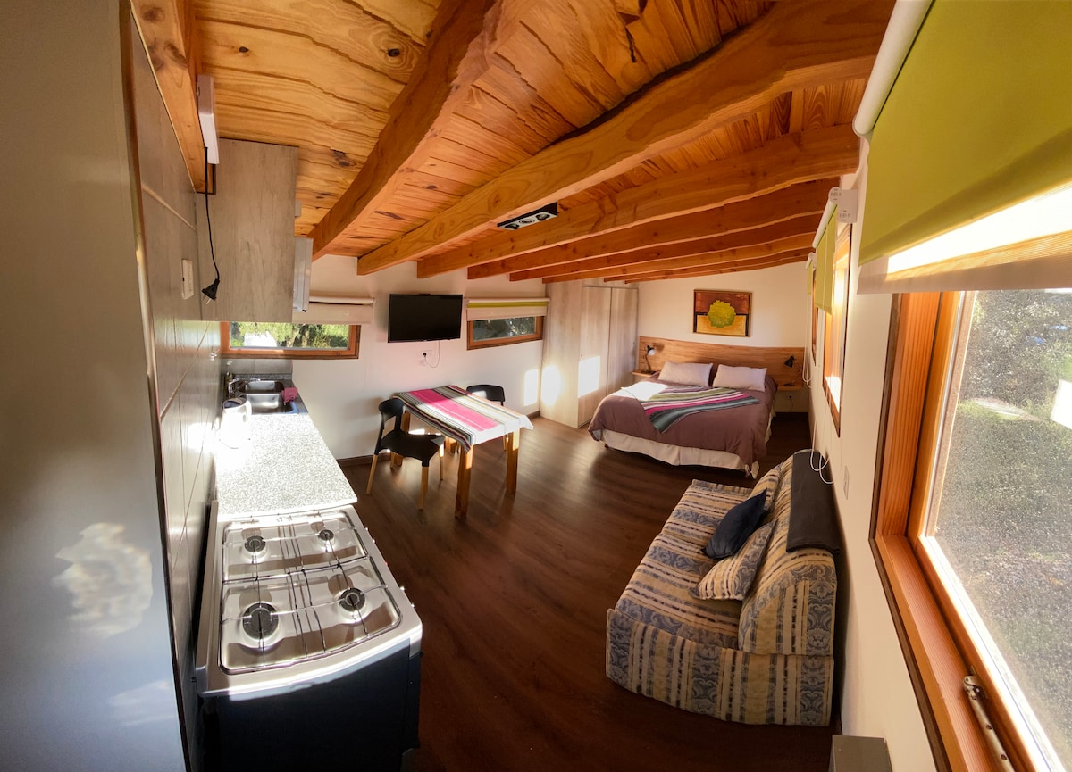 Es construcción nueva en la que utilizamos elementos propios de la zona, un tipico loft, pero al pie de la montaña, un solo ambiente muy humildemente bien decorado, sutilmente íntimo, práctico detalle de la zona de servicios exclusivo, muy reservado, solaz, seguro, con ingreso en auto con portón automático, estacionamiento junto al automovil familiar, hay centros comerciales, a 5’ del centro cívico, buses c/15´Lo fundamental la cordial atención personalizada de Stella & Mario sus dueños.