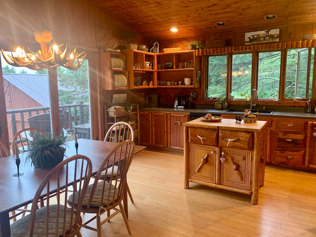 Entorno rural tranquilo. Ubicado en el bosque del condado norte con caminos de tierra para ir en bicicleta y caminar. Muy cerca de senderos para ciclismo y VAST. Casa recién reformada con 3 dormitorios y 2,5 baños. Cocina espaciosa y nueva con armarios a medida y encimeras de granito. Comedor, acogedora sala de estar con múltiples ventanas para observar la vida silvestre natural y los bosques circundantes. Acogedores rincones para leer y una estantería llena de libros, rompecabezas y juegos. Lavadora y secadora nuevas con productos básicos de lavandería.